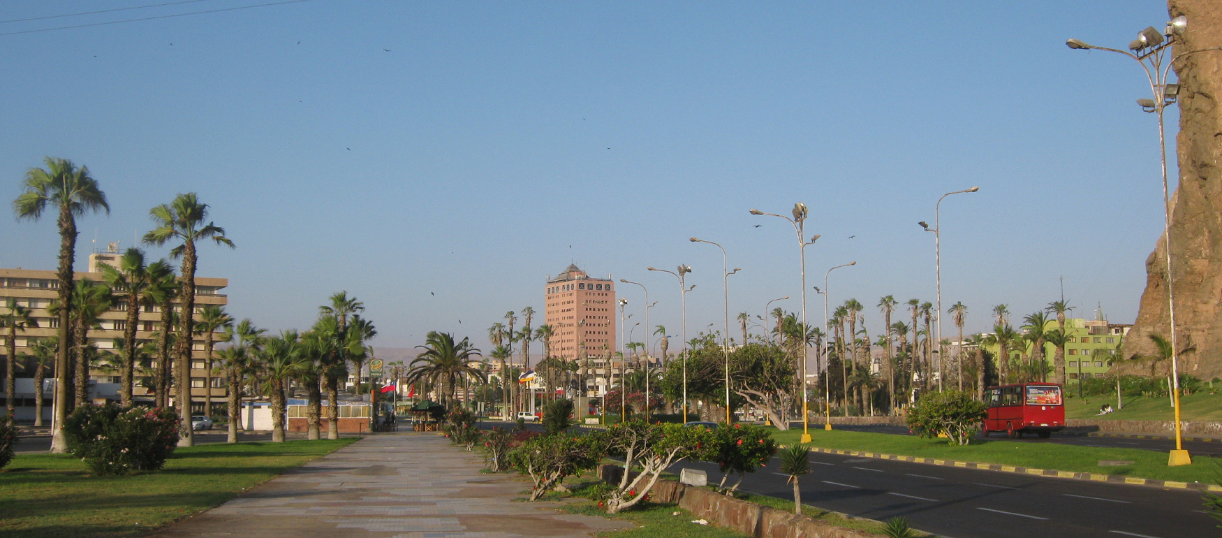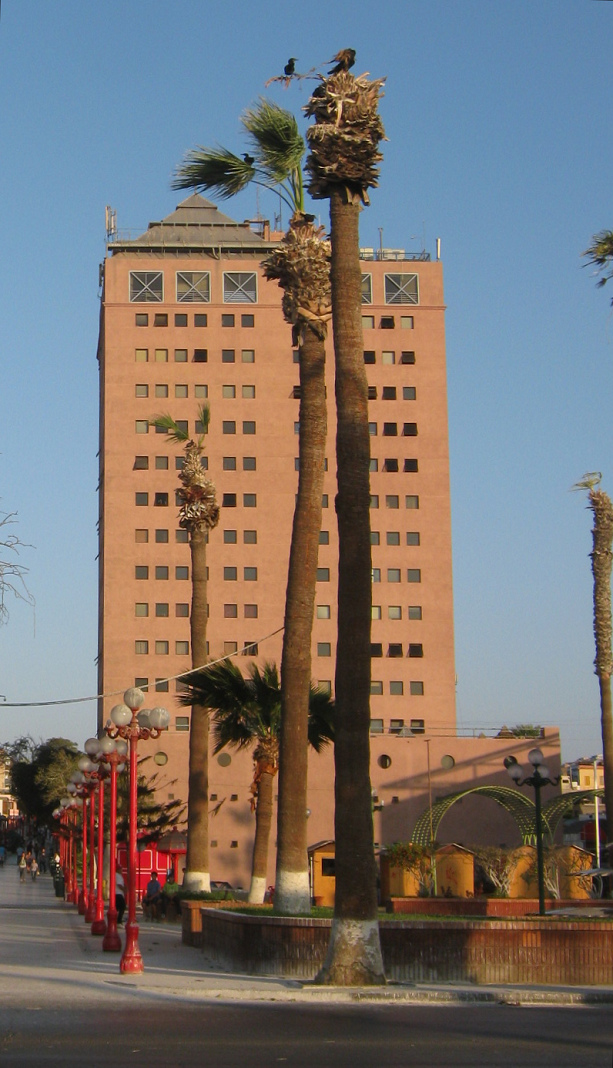 Auf gleicher Höhe auf der anderen Seite der Lira-Allee sieht man den "Handelsturm" ("Empressarial" von Arica mit dem Beginn der Passage des 21. Mai, der entspannenden Fussgängerzone von Arica.