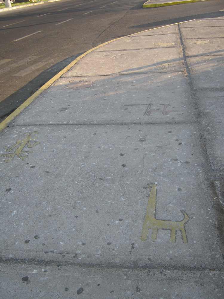Die St.-Martinsallee mit ihren Ansichten und Geoglyphenzeichnungen auf dem Trottoir - Lira-Allee: Das Marine-Zentrum - das Boot am Hafeneingang - der Markt - die Bahnstation nach Bolivien - der Konsulplatz - die Lira-Allee mit dem "Lira"-Markt - die Chacabuco-Allee und die Velasquez-Strasse