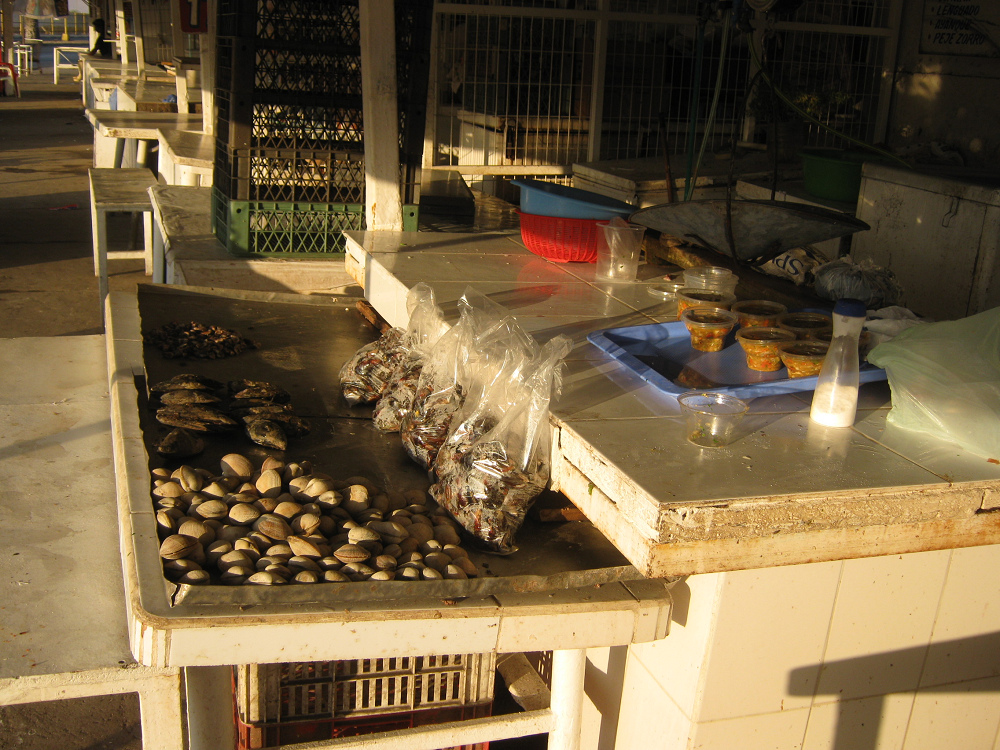 Auf der anderen Seite der Allee ist der Fischermarkt mit seinen Meeresprodukten. Am Abend bleiben nur noch einige Muscheln.