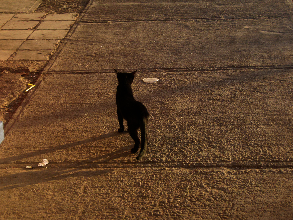 Lira-Allee, der Fischermarkt, eine schwarze Katze in der Abendsonne