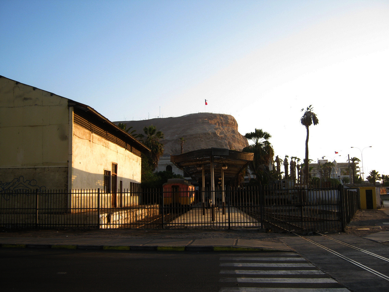 Arica: Die Bahnstation nach Bolivien, das Gebäude, die Bahnsteige und ein Eisenbahnwagen