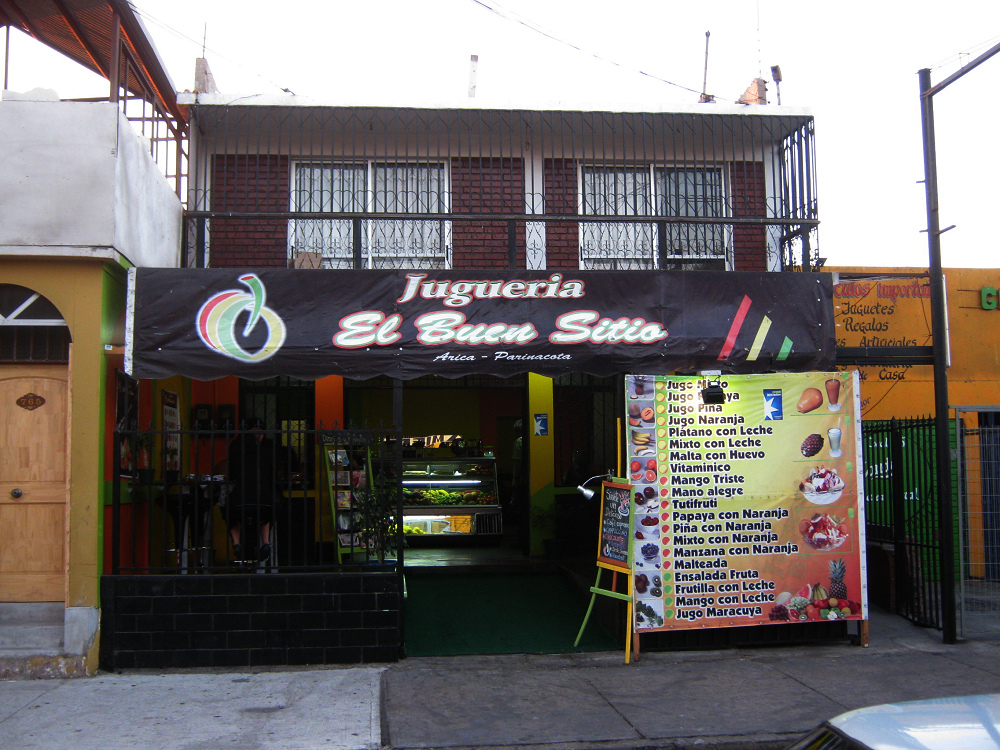 Dann kann man an der Velasquez-Strasse diese Safttheke finden. Es gibt ja in Arica gar nicht so viele Stände, wo man Säfte konsumieren kann. Dies war dann wirklich ein sehr guter Platz für Säfte (gemischte Säfte, mit Papaya, Ananas, Orange, Milchshakes mit Banane oder gemischte Milchshakes, Malz mit Ei, Vitaminsaft, Trauriger Mango ("mango triste"), Lustige Hand ("mano alegre"), Tutifruti, Papayasaft oder Orangensaft, Ananas-Orangensaft, gemischter Saft mit Orange, Apfel-Orangensaft, Milchshakes, Erdbeershake, Mangoshake, Maracuyasaft, und Fruchtsalat.