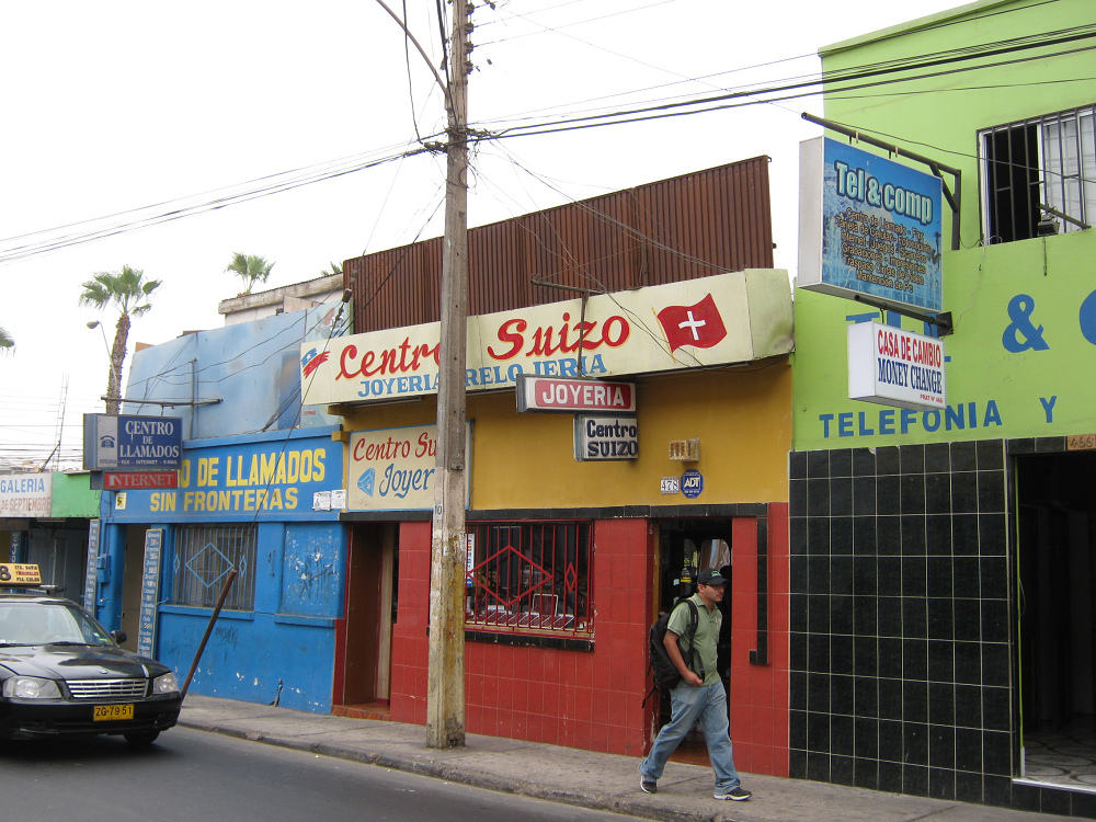Dieses "Schweizer Zentrum" in Arica ist ein Schmuckgeschäft. Ich ging hinein und wollte schweizer Uhren sehen. Aber schweizerische Produkte hatten die da nicht, sondern die haben nur den Namen geklaut. Und das Schweizer Kreuz auf der Fahne ist auch ein wenig schlank geraten. Das ist eben eine chilenische Schweizer Fahne...