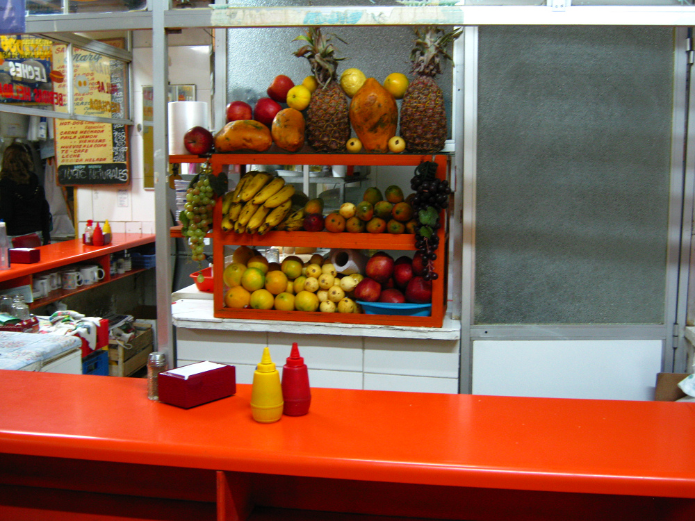 Im Markt von Arica an der Kolumbusstrasse ("calle Colón") gibt es einige Früchtestände. Einer davon ist dieser hier. Papaya und Mangos werden in den bewässerten Tälern Chiles gezüchtet und sind deswegen nicht sehr gross. Mir schienen sie nicht so süss wie in Peru.