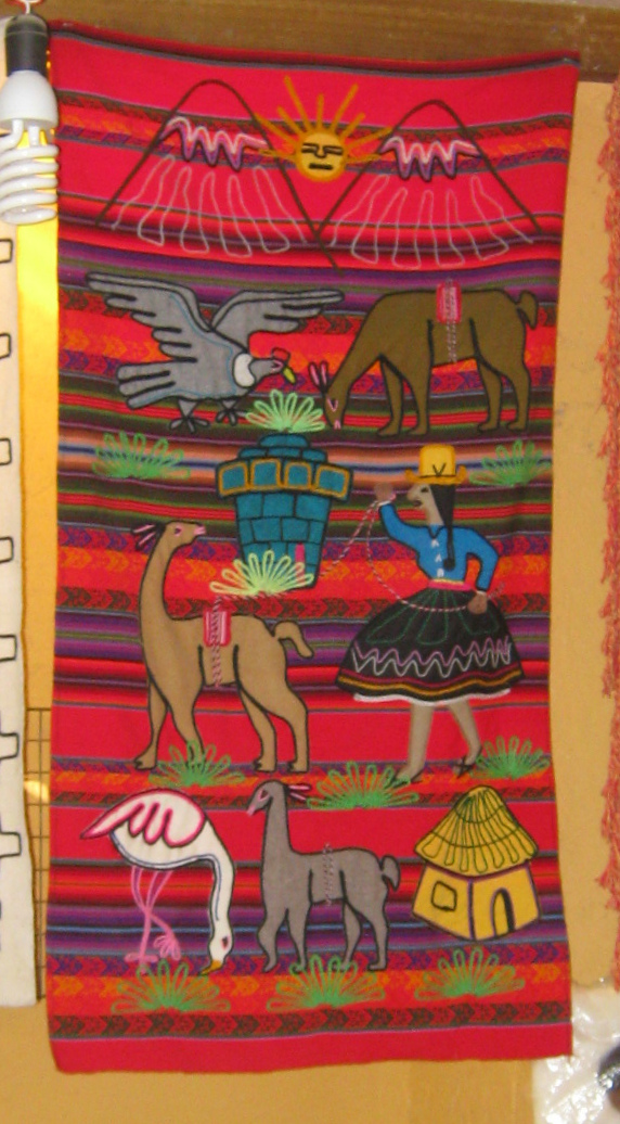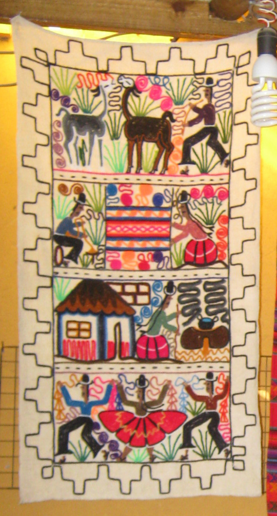 Der weisse Wandteppich zeigt einen Bauern mit seinen Lamas, zwei Weberinnen, die einen Wandteppich weben, eine Sierra-Bewohnerin, die an einem Feuerherd kocht, und daneben ein Häuschen, sowie zuunterst drei tanzende Personen, ein Mann und zwei Frauen.