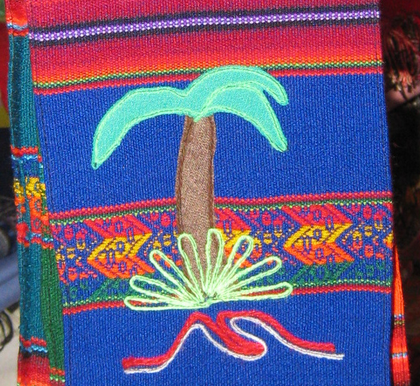 Hier sehen wir eine Weberei in Form eines breiten Bandes mit den Motiven der chilenischen Sierra, eine Sierra-Bewohnerin, eine Palme am Strand als Verbindung mit der Küste, und ein Lama.