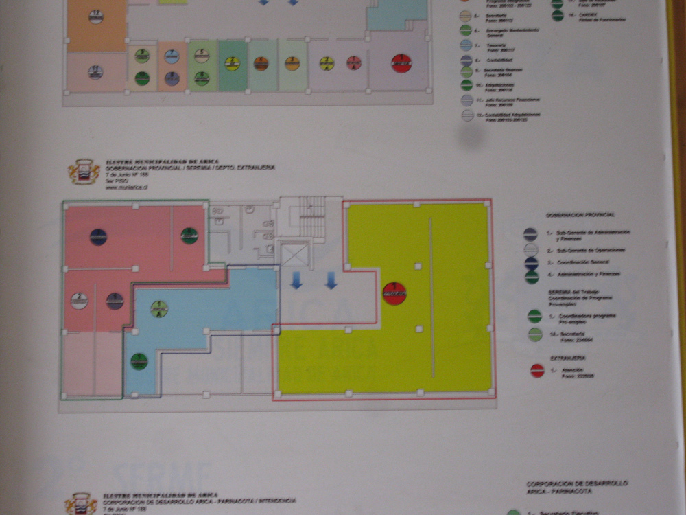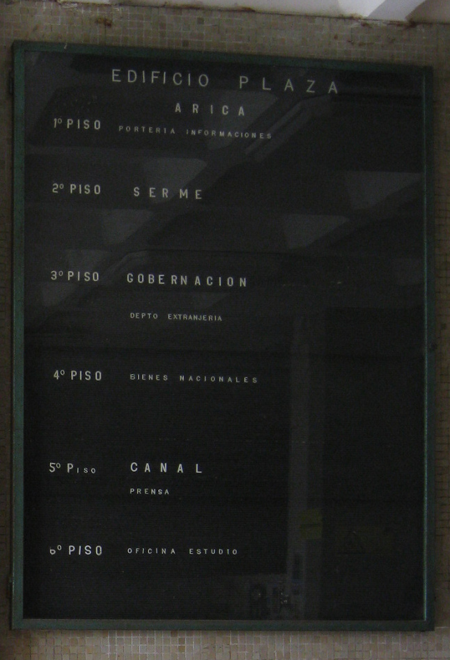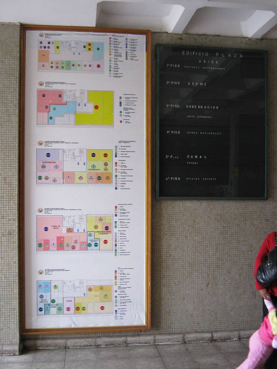 Am Eingang war diese Tafel angebracht mit der Angabe, dass hier die "chilenische Regierung" mit seinem "Heimatministerium" ("ministerio de bienes nacionales") untergebracht sei, mit dem "dem Sekretariat des Ministerialministeriums" ("secretaria regional ministerial") für die Region Arica und Parinacota ("región de Arica y Parinacota"). Es folgte eine grosse Tafel mit den Angaben der verschiedenen Büros. Aber auch diese Angaben waren wieder derart klein geschrieben, dass man das kaum lesen konnte.