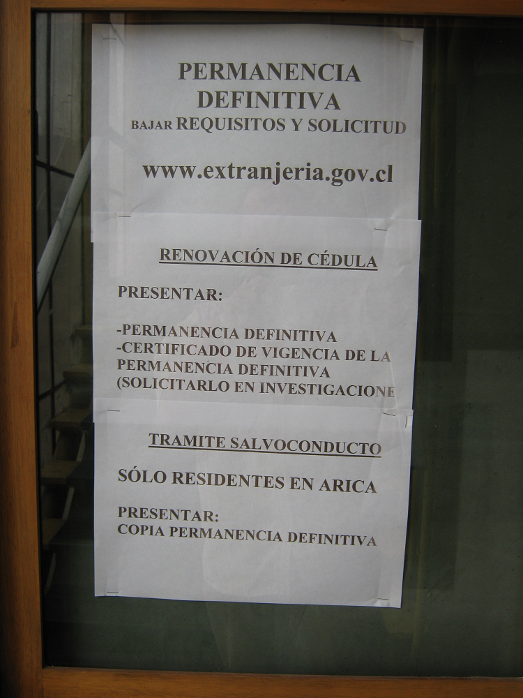 Passierscheinverfahren ("tramite salvoconducto") können nur für Einwohner von Arica erledigt werden, mit einer Kopie der definitiven Aufenthaltserlaubnis.