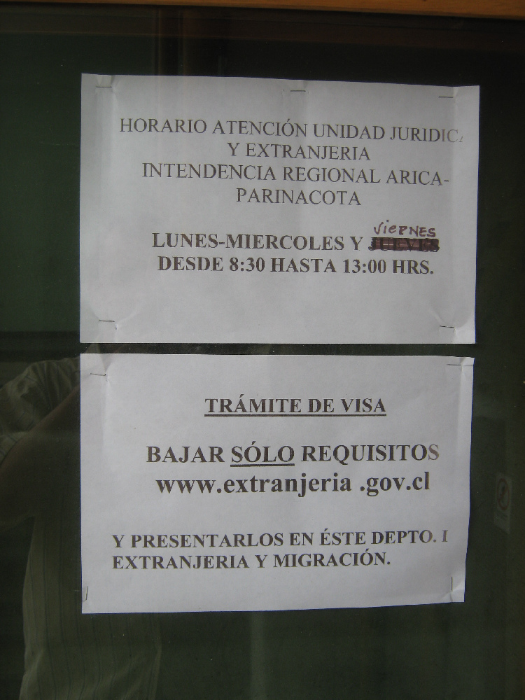 Es ist aber besser, Visaangelegenheiten für die Einwanderung in der Hauptstadt Santiago zu regeln, denn wenn ein Antrag in Arica gestellt wird, muss dieser Antrag sowieso nach Santiago geschickt werden.