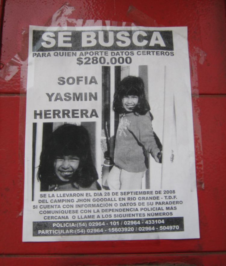 Am 28. September 2008 auf dem Camping John Godall in Río Grande - T.D.F. wurde sie entführt. Informationen und Daten ihres Aufenthalts können bei der nächsten Polizeidienststelle angegeben werden, oder rufen Sie folgende Nummern an: Polizei: (54) 02964 - 101 / 02964 - 43314; Speziell: (54) 02964 - 15603920 / 02964 - 504970.>