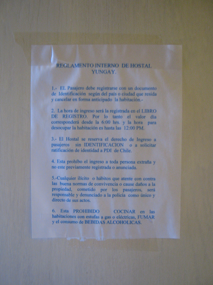 Das Reglement des Hostals Yungay