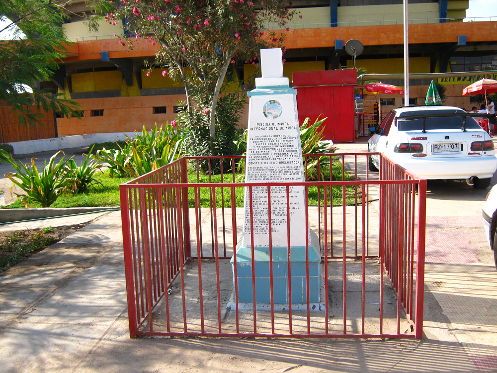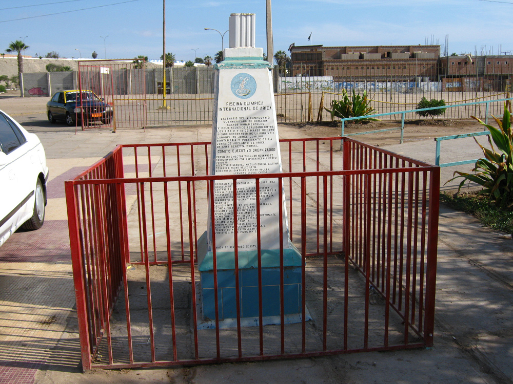 Escenario del y campeonato sudamericano de natación, saltos ornamentales y polo acuático realizado entre los días 2 y 10 de marzo de 1975, siendo gobernador de la provincia Coronel Dn. Jorge Dowling Santamaría y presidente de la junta de adelanto von Arica, Dn. Luis Beretta Porcel.
