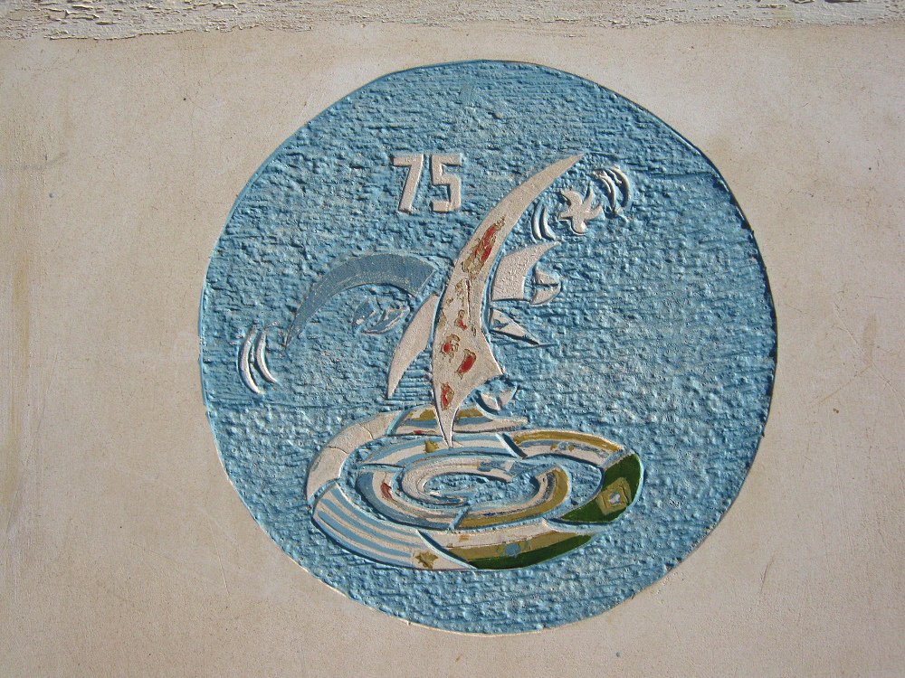 Das Schwimm-Olympiastadion-Denkmal, Logo mit Möven und der Nummer 75