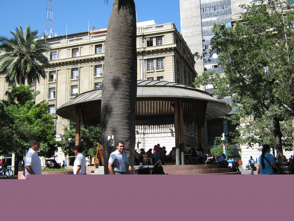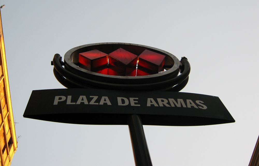 Waisenkinderstrasse (calle Huérfanos), der Eingang zur U-Bahnstation "Zentralplatz" (Waffenplatz, plaza de Armas), das Logo der U-Bahn von Santiago de Chile mit drei roten Trapezen
