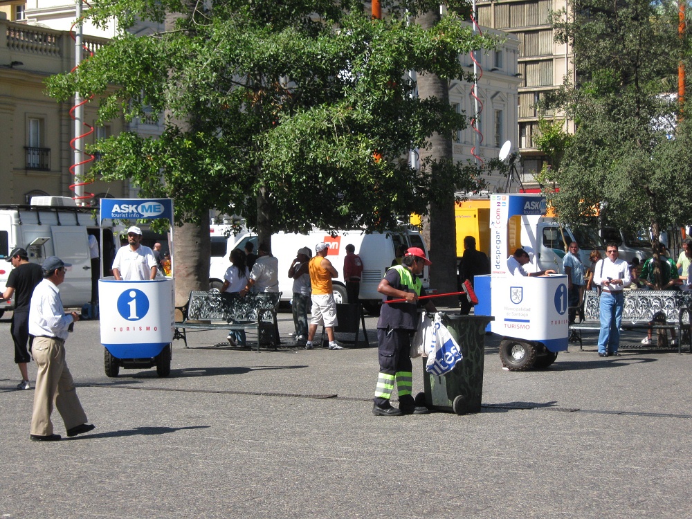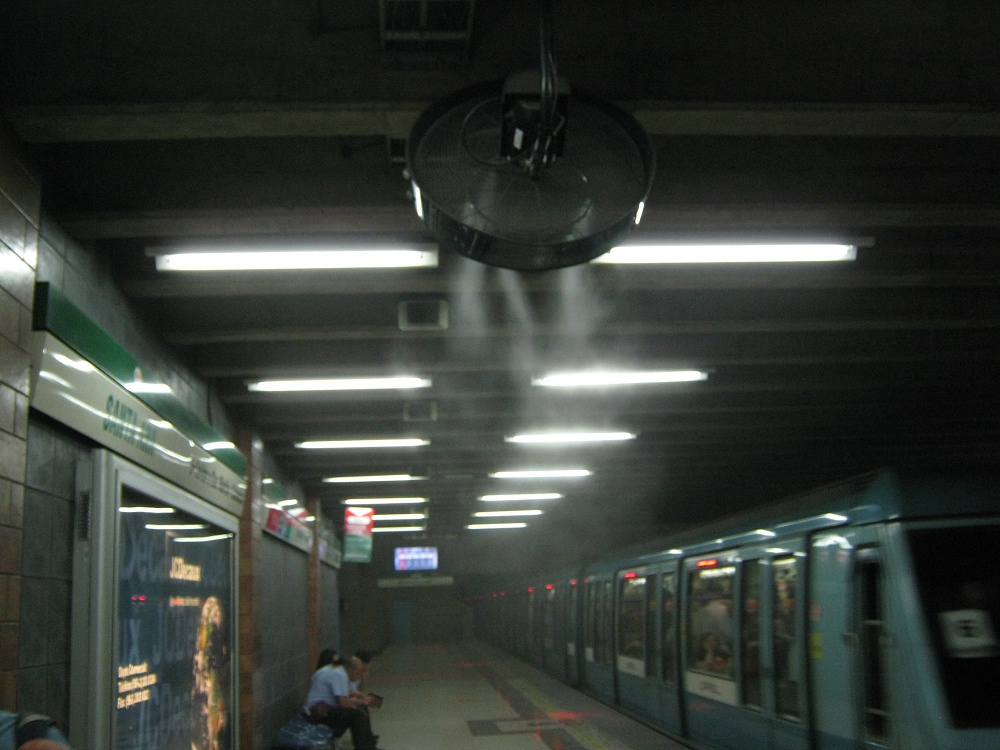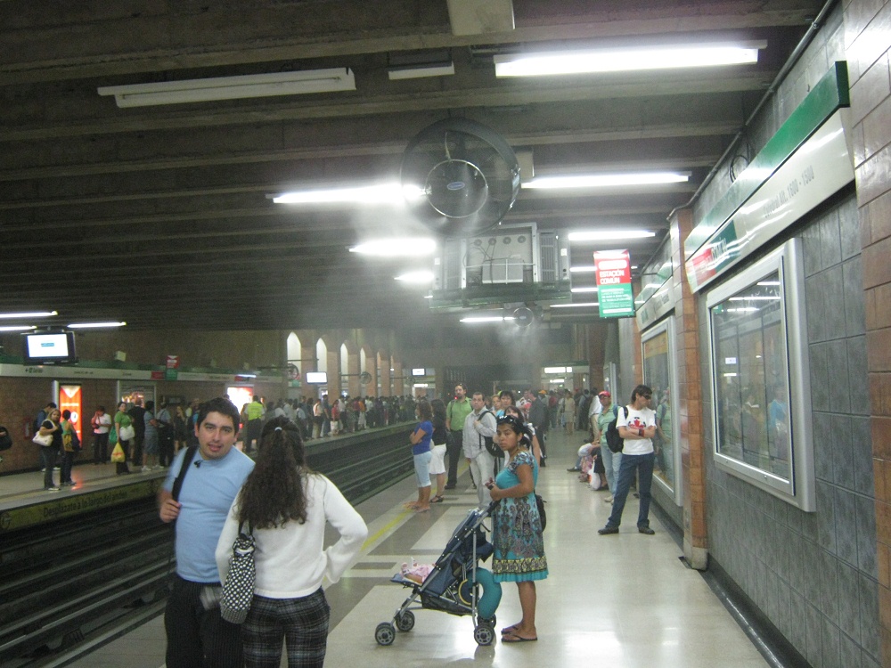 Im Sommer wird in den U-Bahnstationen in Santiago mit Feuchtigkeits-Ventilatoren Feuchtigkeit "ausgestrahlt". Luxus, aber jeder soll ihn haben.