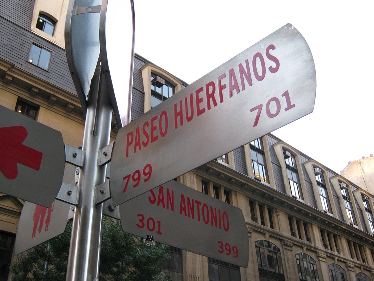 Strassenschilder Waisenkinderstrasse (calle Huérfanos) und Cummingallee (avenida Cumming)