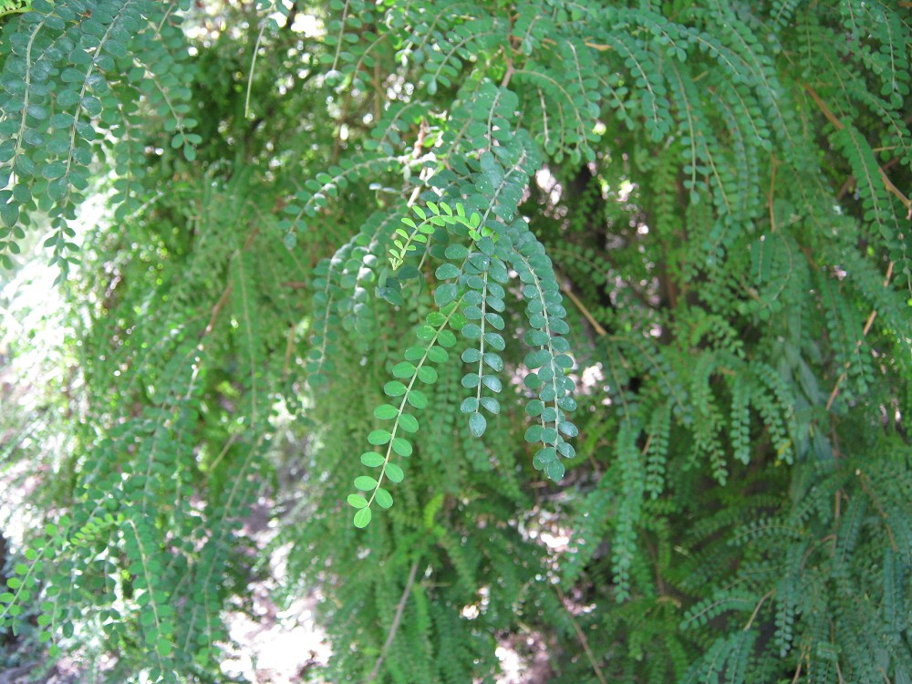 Die Fiederblättchen des Pelú (lat. Sophora microphylla), Nahaufnahme