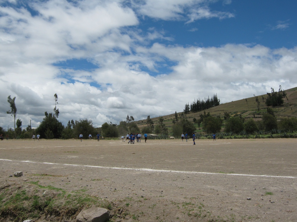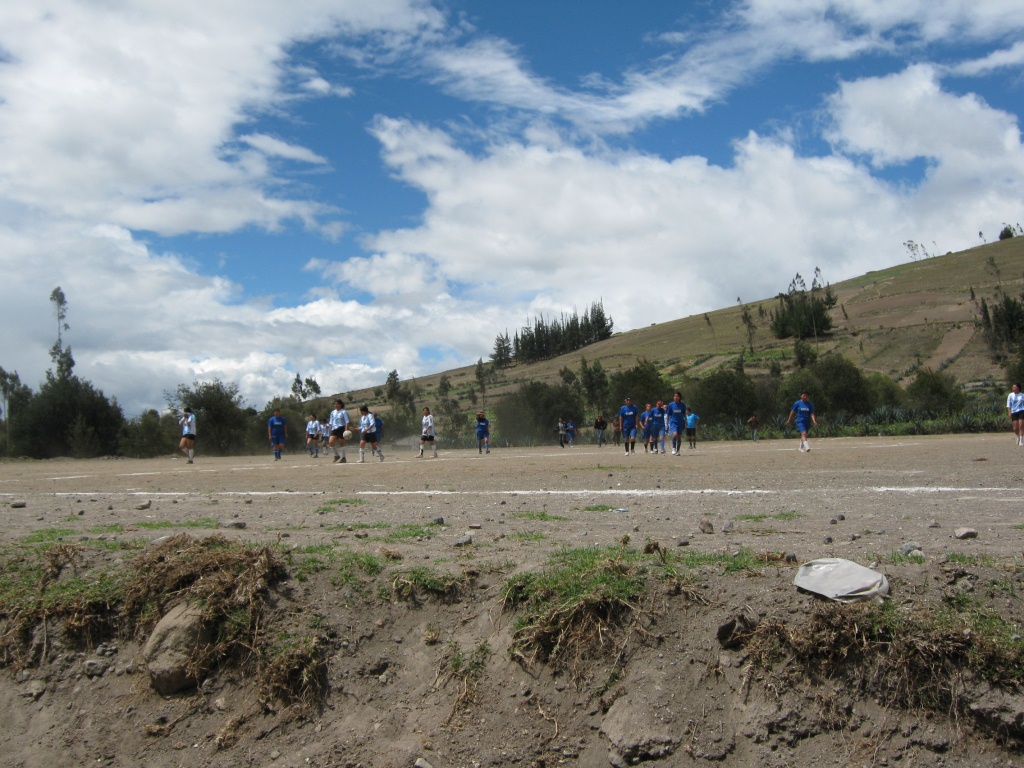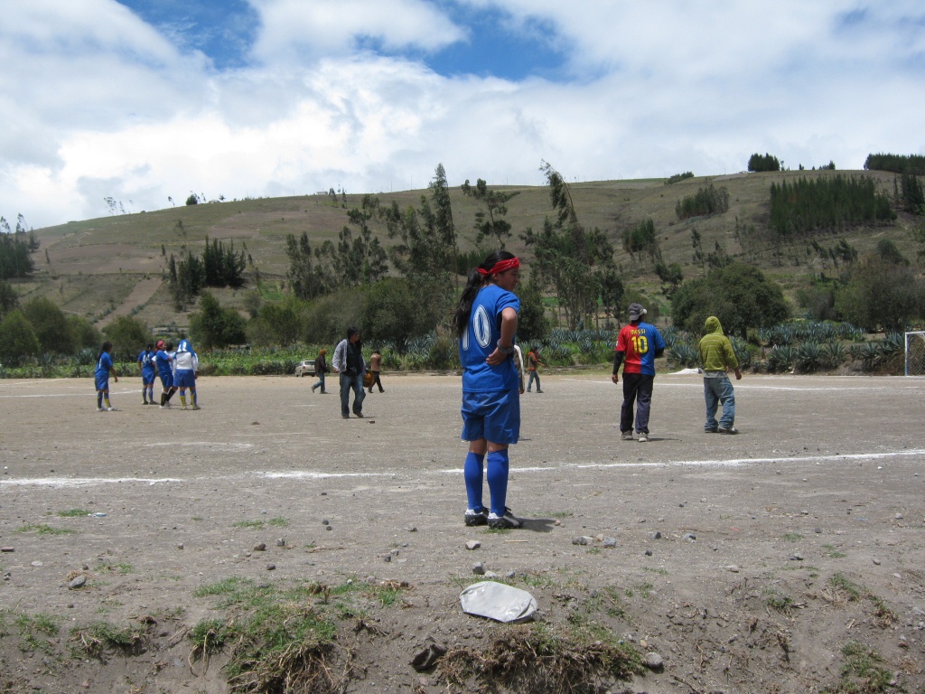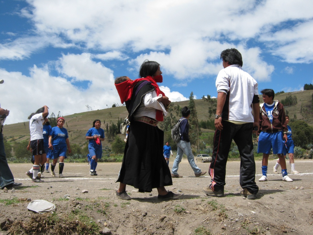 Salasaca wechselte ein. Wie man sieht, sind nicht sehr viele Zuschauer anwesend, sondern nur ein paar Familienangehörige. Ansonsten ist die Rennerei mit einem Ball hier auf lokaler Ebene gar nicht so populär. Zuvor fand ein Fussballspiel der Männer statt, und auch dort waren kaum Zuschauer anwesend. Es geht also eher um den "Plausch" der Spieler und Spielerinnen selbst, während viele Eltern auf den Feldern sind.