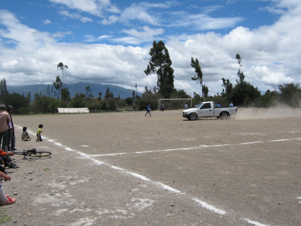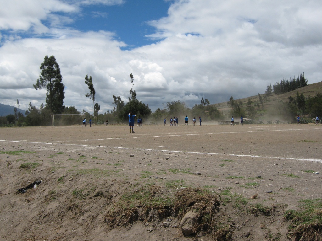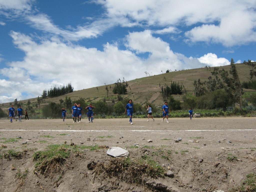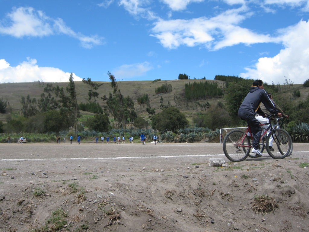 Salasaca wechselte ein. Wie man sieht, sind nicht sehr viele Zuschauer anwesend, sondern nur ein paar Familienangehörige. Ansonsten ist die Rennerei mit einem Ball hier auf lokaler Ebene gar nicht so populär. Zuvor fand ein Fussballspiel der Männer statt, und auch dort waren kaum Zuschauer anwesend. Es geht also eher um den "Plausch" der Spieler und Spielerinnen selbst, während viele Eltern auf den Feldern sind.