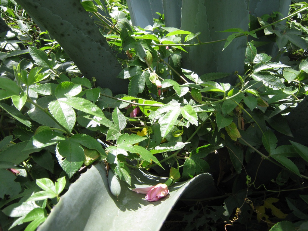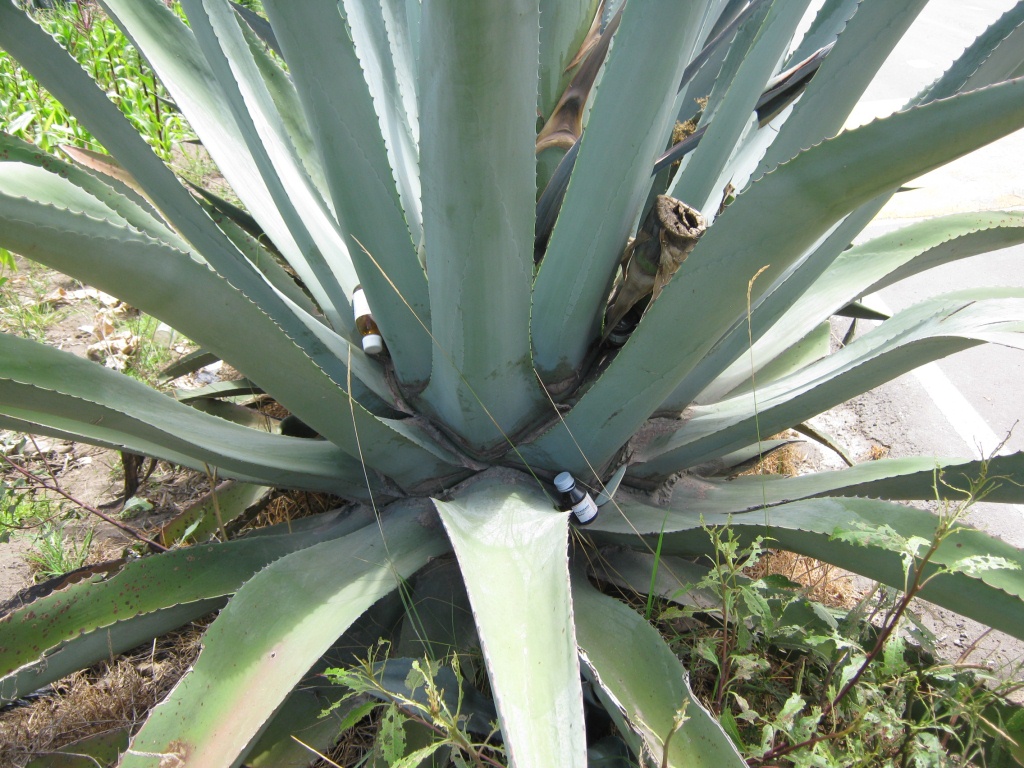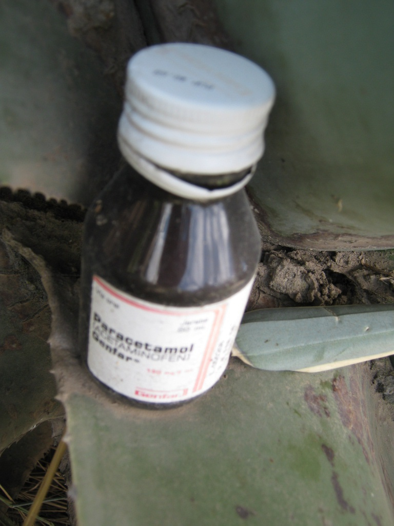 Und zuletzt schaute ich aus Neugierde in die grosse Cabuya am Strassenrand vor dem Gästehaus, um zu sehen, wie die Blattansätze angeordnet sind, und fand dort ein altes Medizinfläschchen Paracetamol.