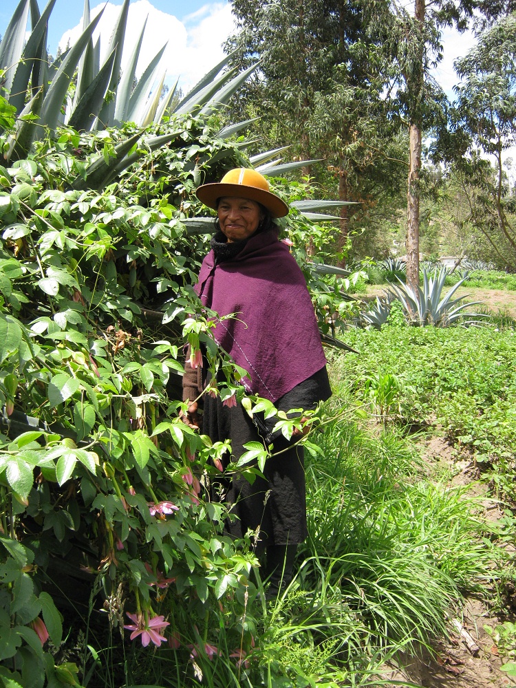 Franziska mit dem goldfarbenen Dorfhut am Taxo-Strauch (Curuba-Strauch).