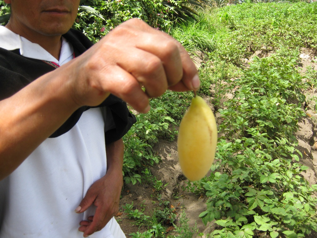 José zeigt eine gelbe Frucht des Taxo-Strauchs (Curuba)