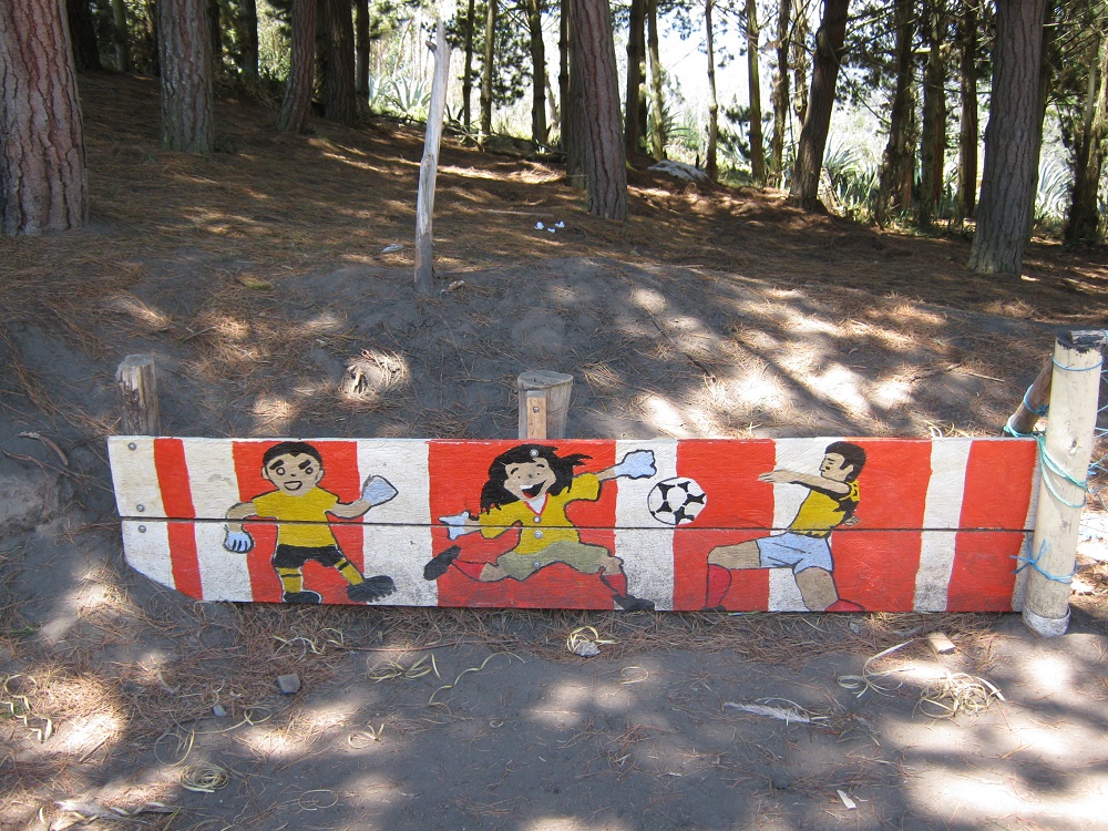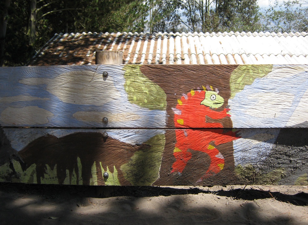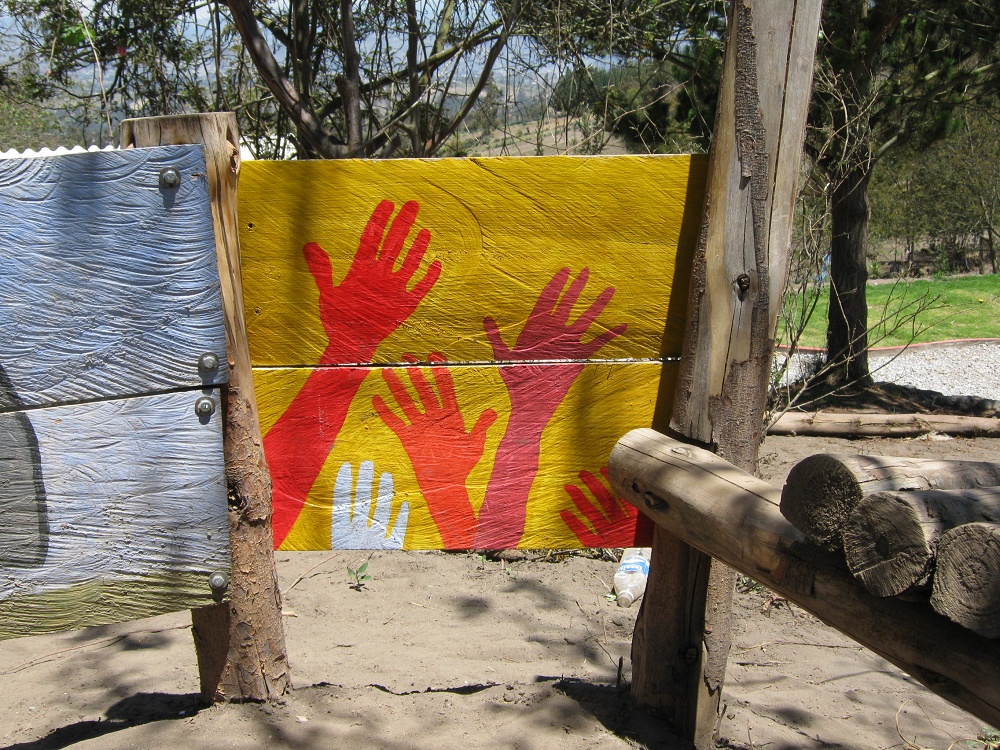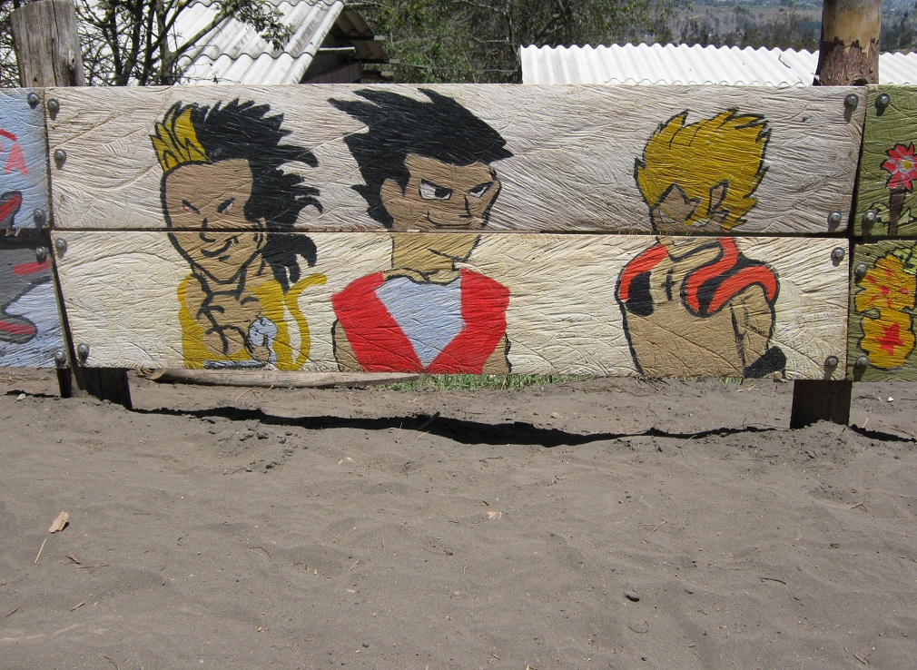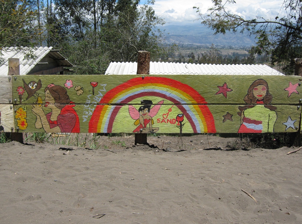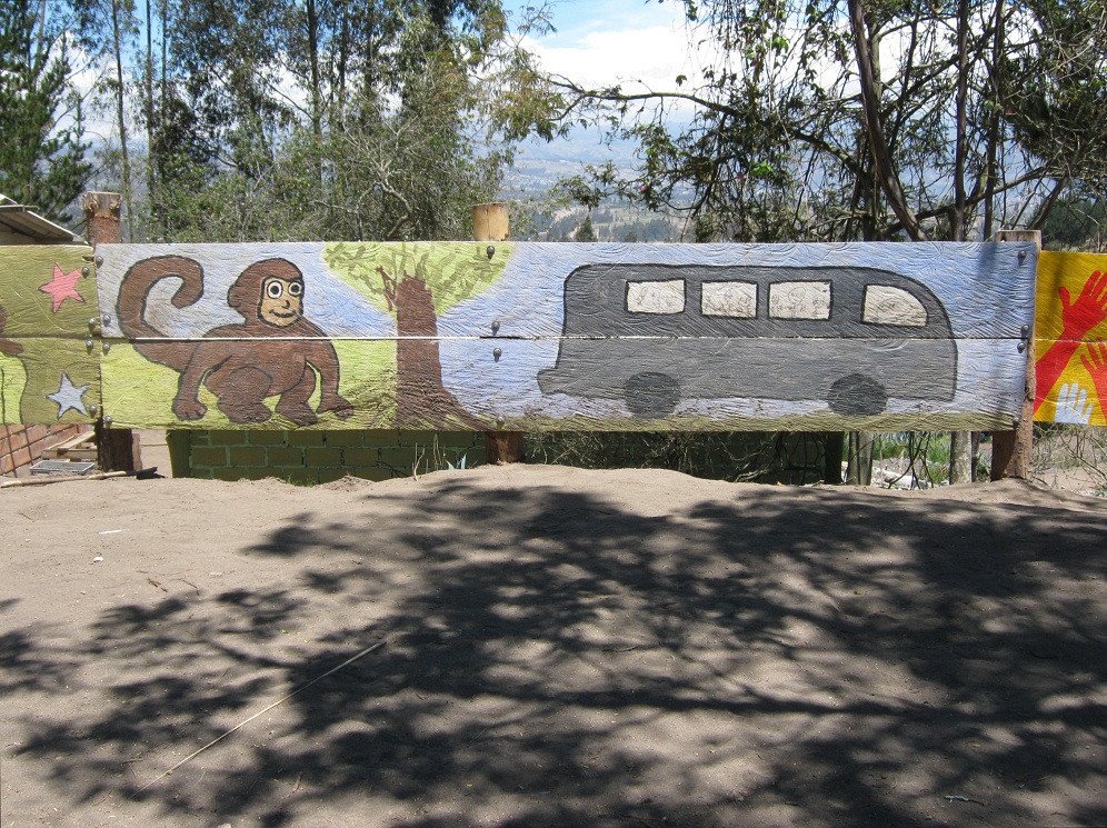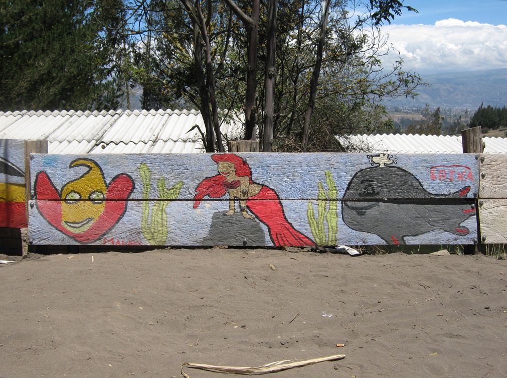 Dagegen strahlte der Sportplatz mit seinen vielen gemalten Motiven eine einmalige Fröhlichkeit aus und stellte viele Kinderträume und Lebensumstände der Kinder und der Familien in Ecuador dar.