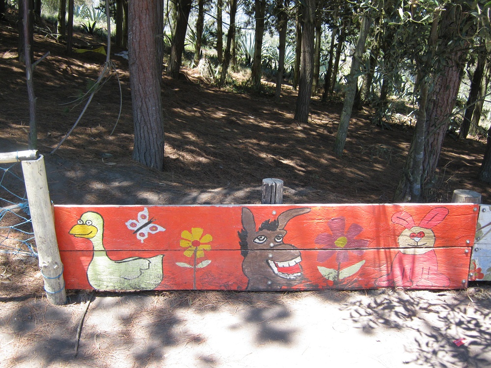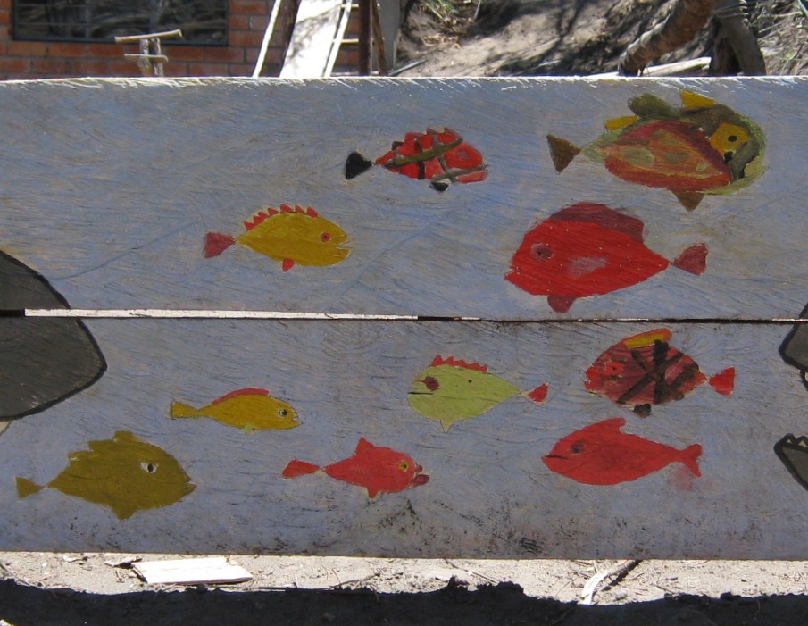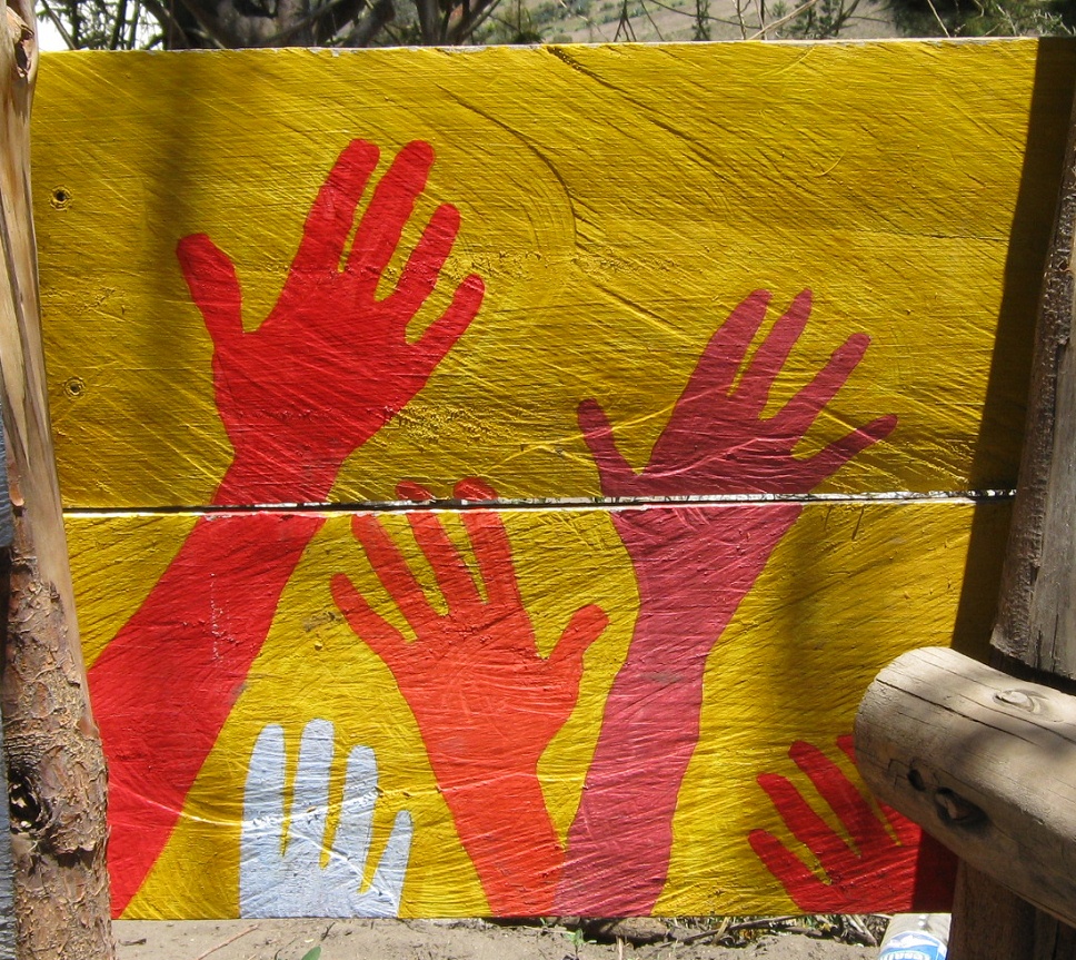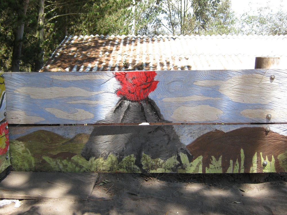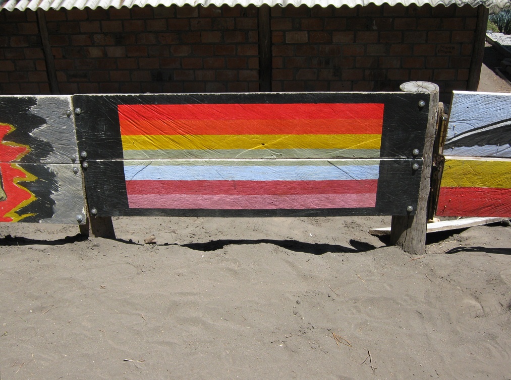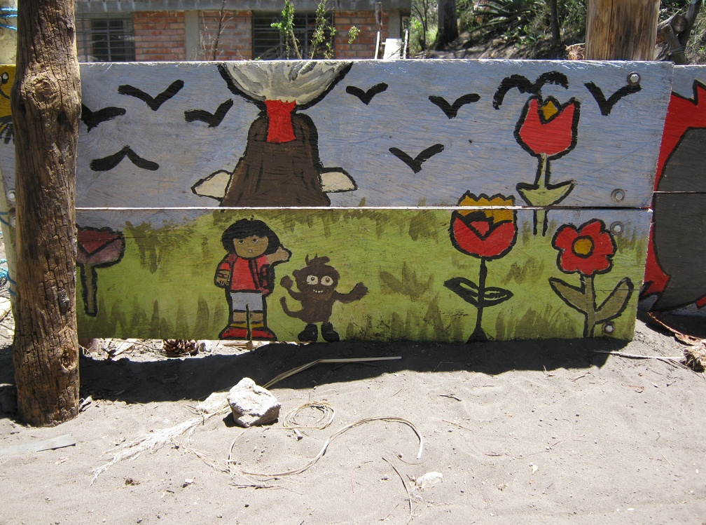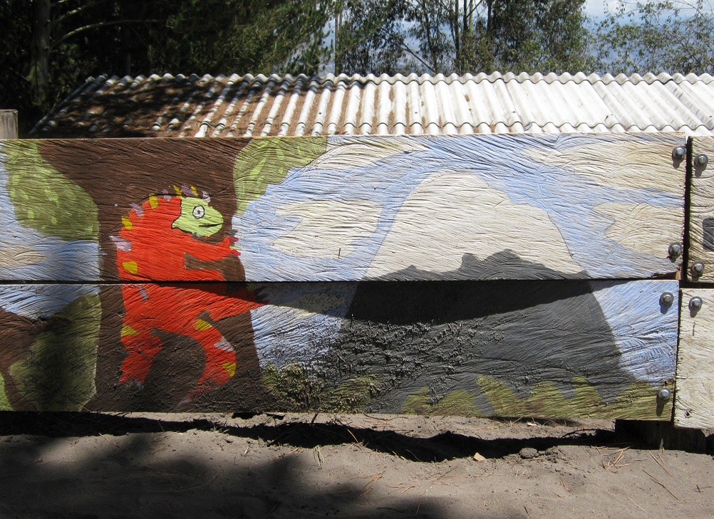 Dagegen strahlte der Sportplatz mit seinen vielen gemalten Motiven eine einmalige Fröhlichkeit aus und stellte viele Kinderträume und Lebensumstände der Kinder und der Familien in Ecuador dar.