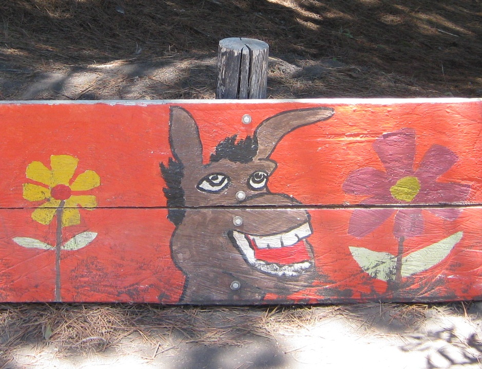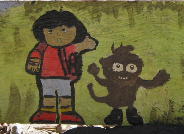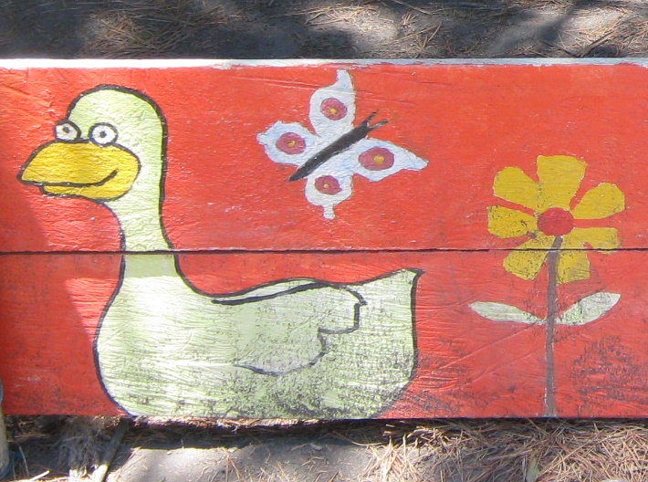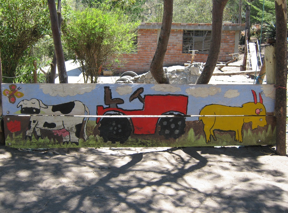 Diese Malerei mit dem Traktor ist für die Sierra unrealistisch, denn alle Feldarbeit in den Anden wird noch von Hand gemacht, und für die kleinen Felder lohnt sich auch kein Traktor. Hier wurde also irgendein "Fortschrittsglaube" eines Buches nachgemalt.
