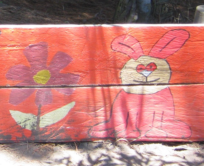 Spielplatz und Sportplatz mit einer bemalten Holzbande mit vielen Malereien