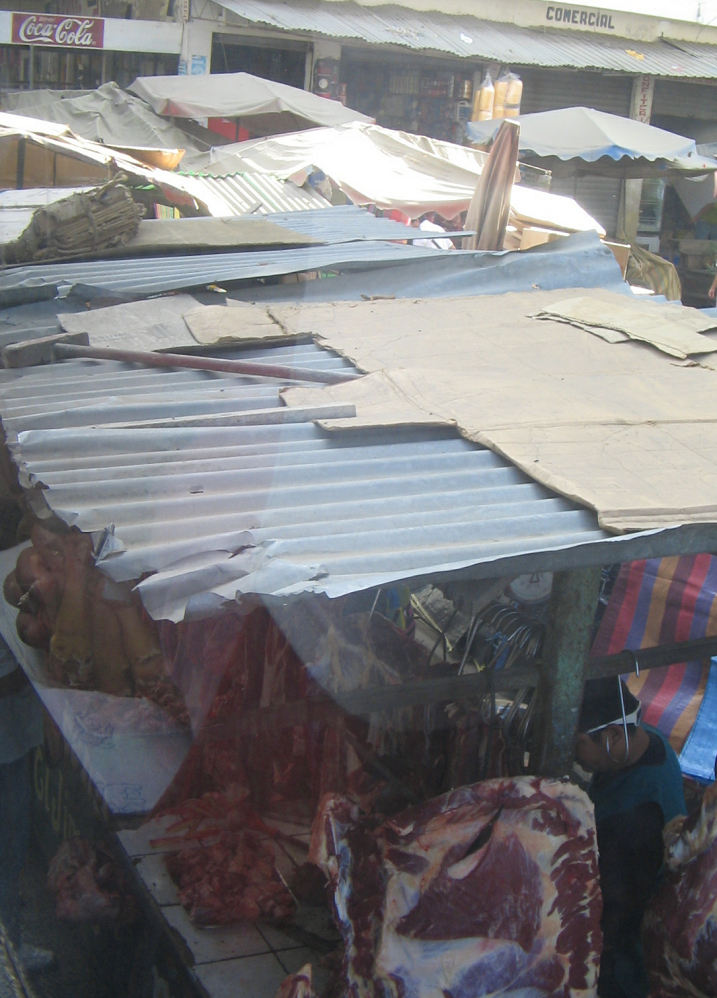 Strassenmarkt mit Fleischstand, Wellblechdächer,