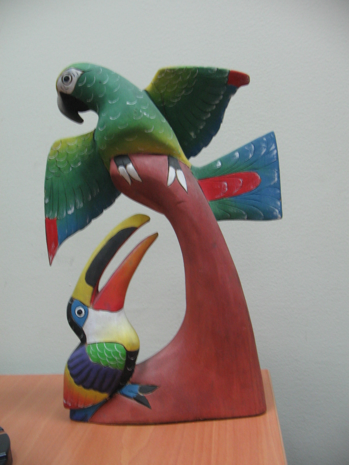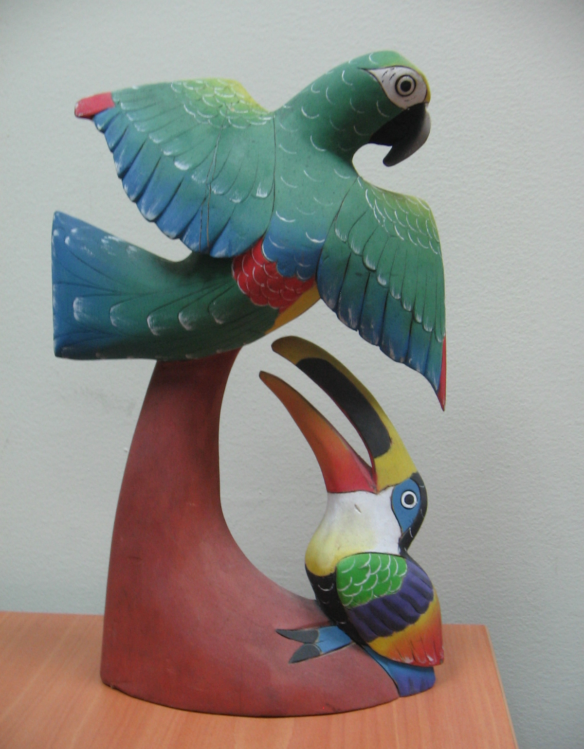Balsaholz-Statue mit einem Papagei und einem Tukan