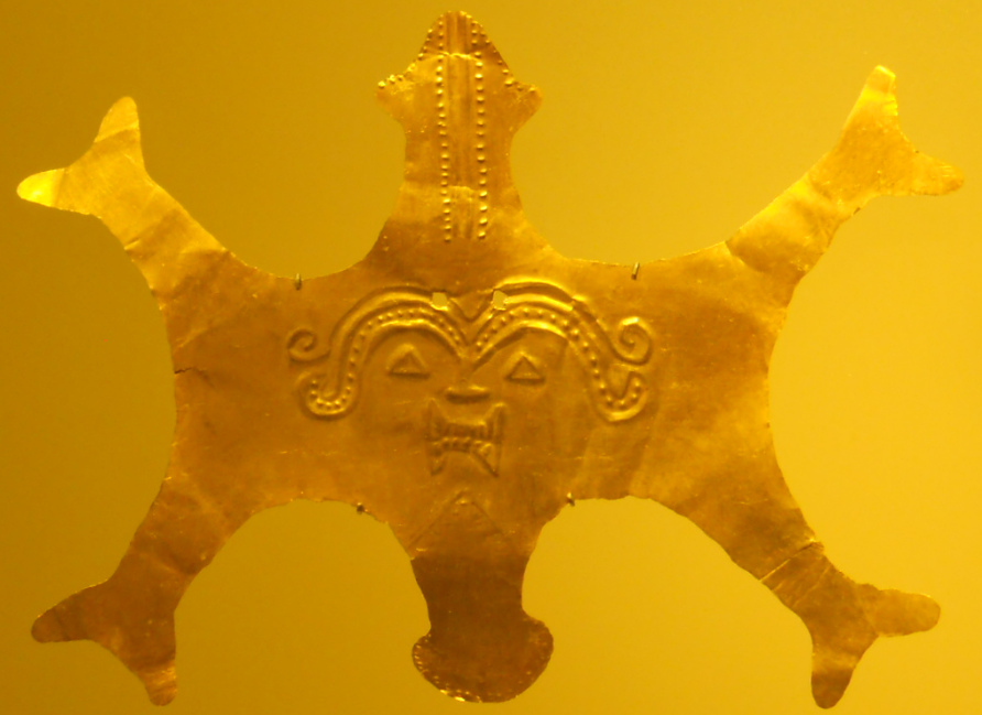 Cultura Nariño, máscara pectoral - dos dioses extraterrestres con ojos sobresalientes - dios extraterrestre con ojos sobresalientes, primer plano - diosa primer plano