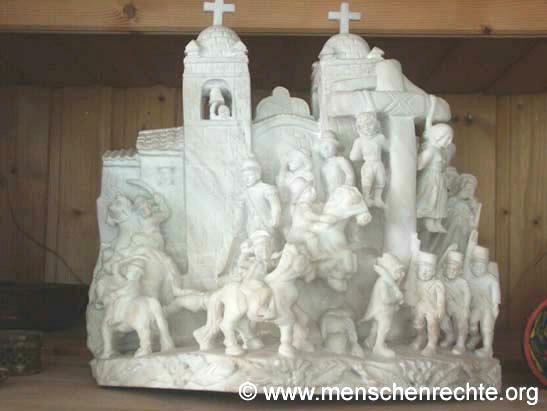 -- die Altarbilder ("retablos"), die Szenen aus dem täglichen Leben darstellen (fabriziert aus Alabaster mit Figuren aus Gips)