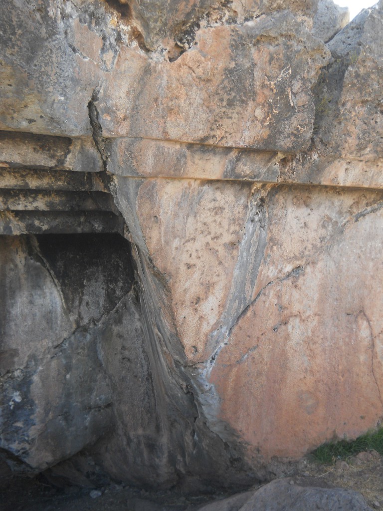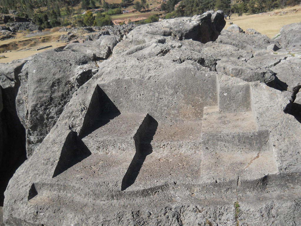 Sacsayhuamán (Cusco), grosser Steinbruch, der Fels mit der umgekehrten Treppe und Thron, Nahaufnahmen