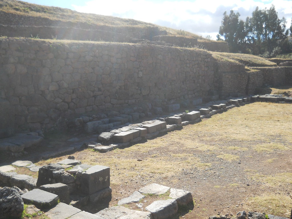 Sacsayhuamán (Cusco), grosser Steinbruch, die Ansammlung Steine 04 - eine grosse Mauer und rechteckige Steine am Fuss der Mauer