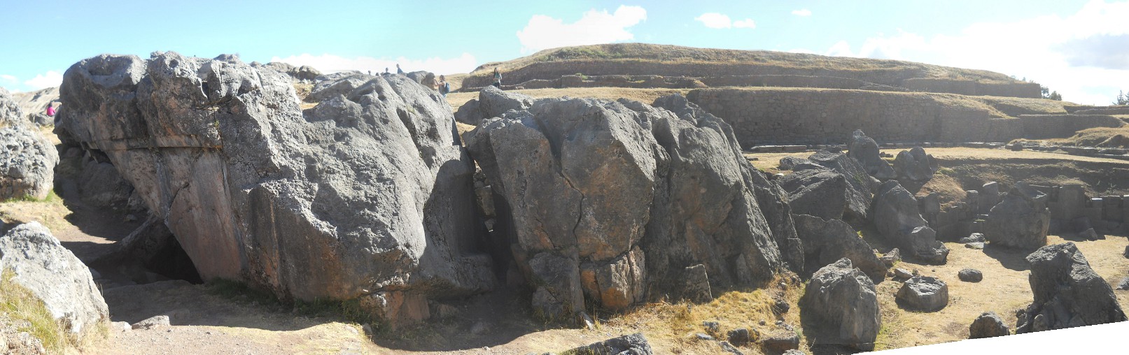 Sacsayhuamán (Cusco), grosser Steinbruch 01, gigantische, geschmolzene und geschnittene Steine, Panorama