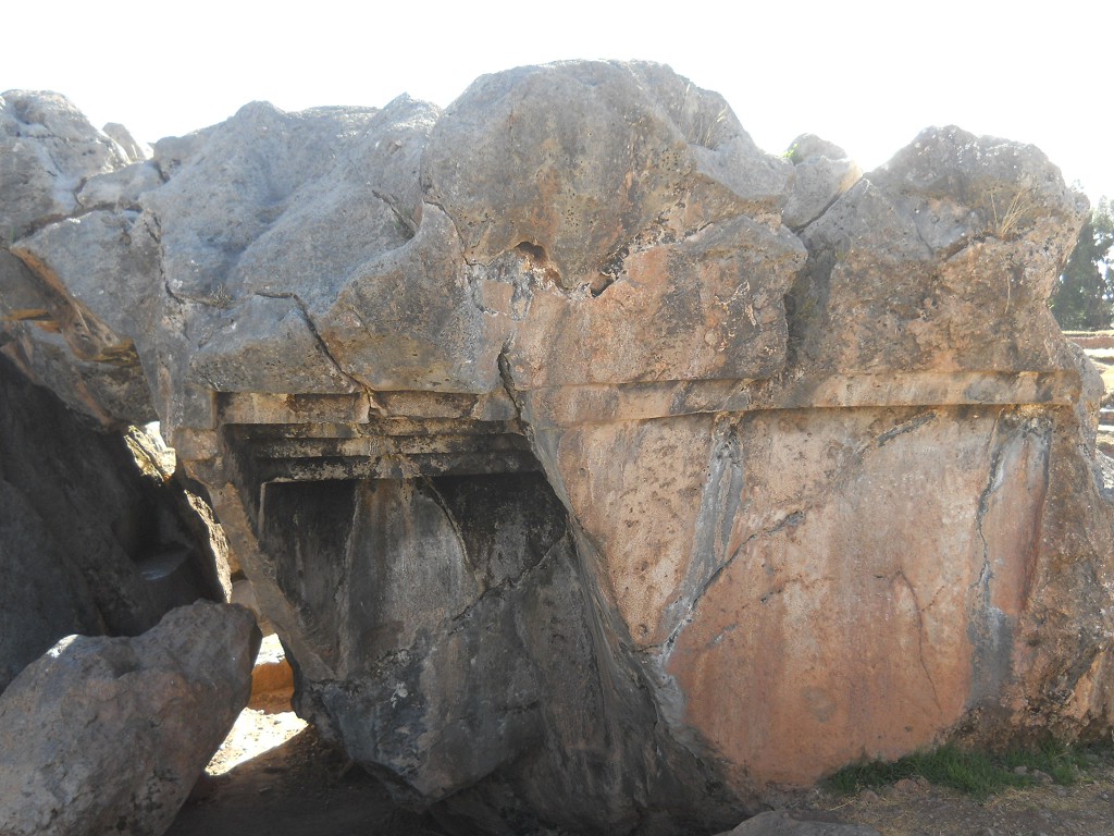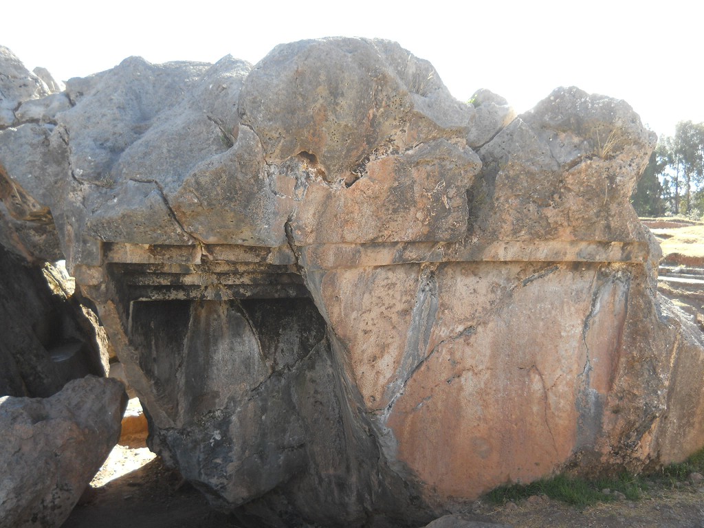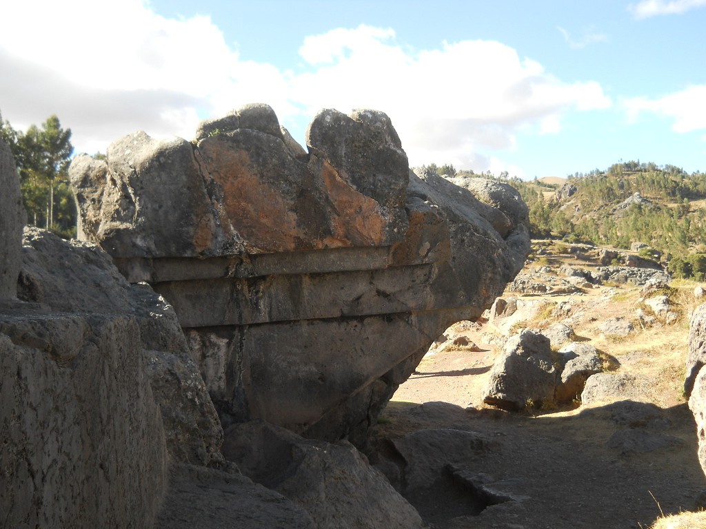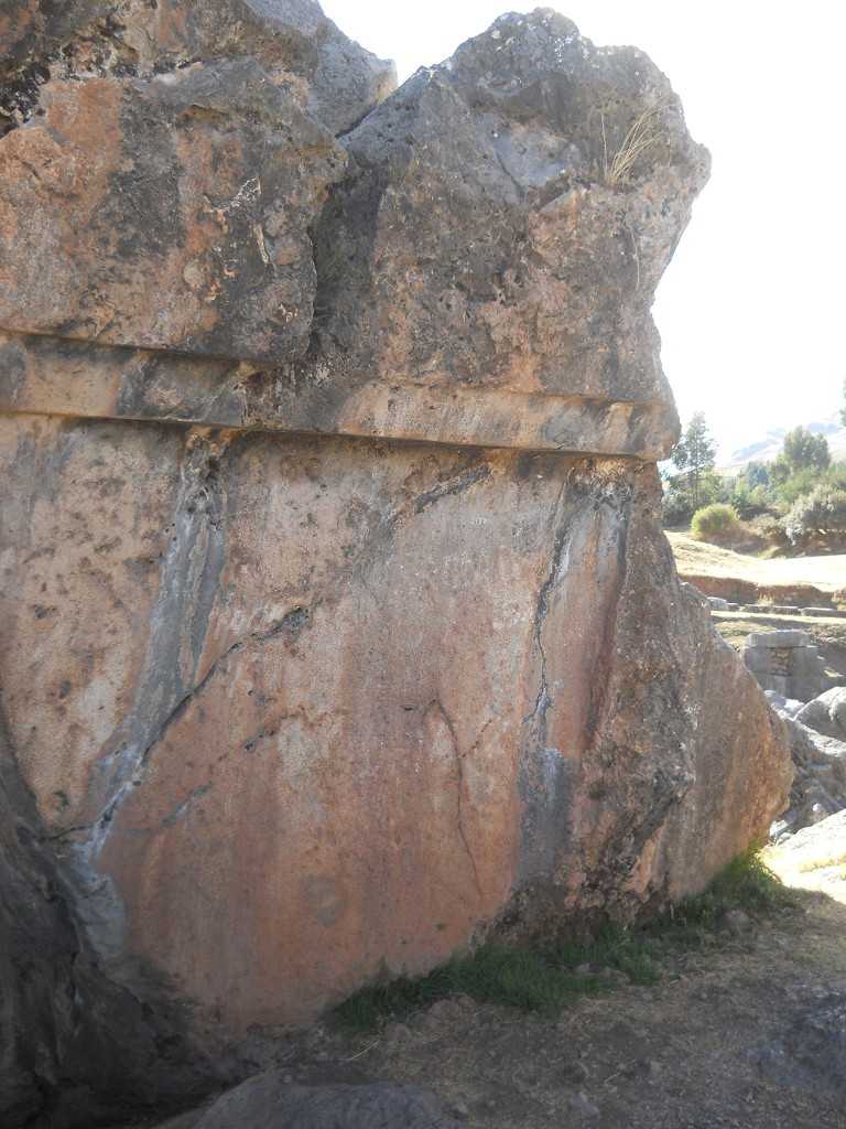 Sacsayhuamán (Cusco), grosser Steinbruch 01, Mehrfachthron Frontansicht - Seitenansicht