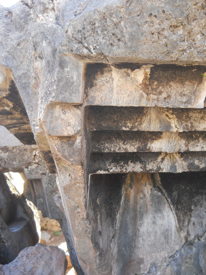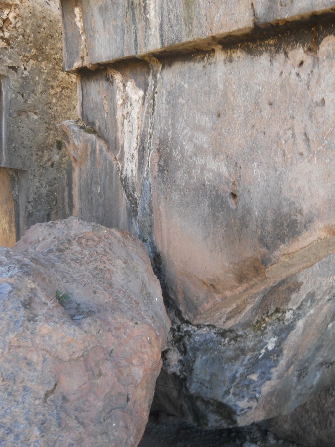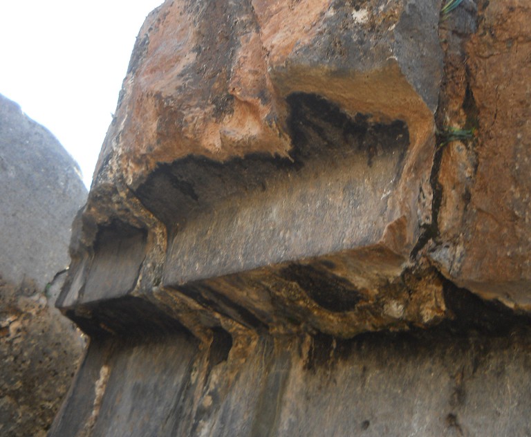 Sacsayhuamán (Cusco), grosser Steinbruch 01, gigantische, geschmolzene und geschnittene Steine 01, die umgekehrte Treppe, Nahaufnahme