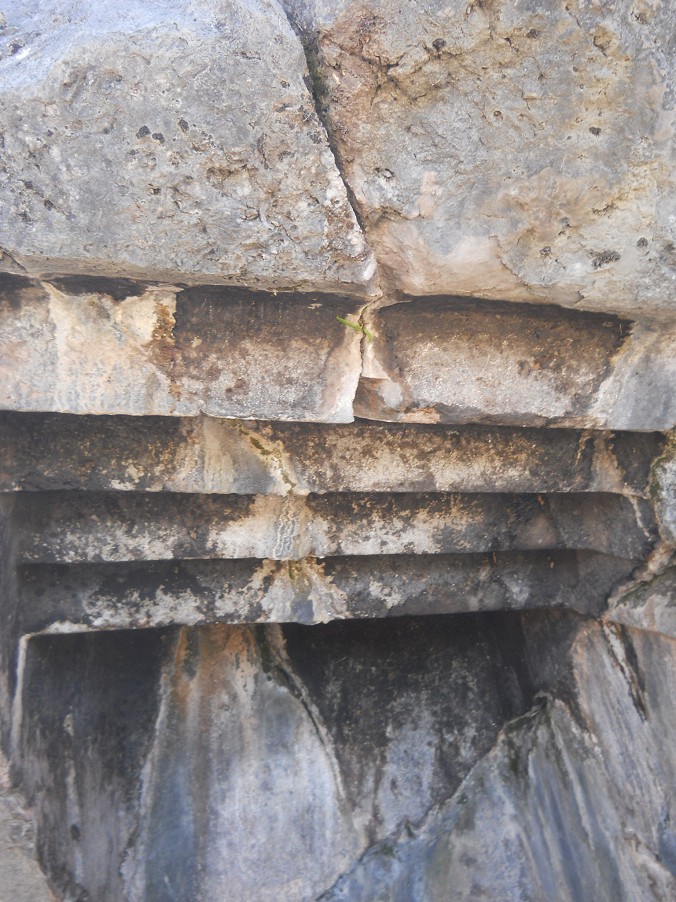 Sacsayhuamán (Cusco), grosser Steinbruch, die Treppenflächen der umgedrehten Treppe, Nahaufnahme 3,4 - gerade Schnitte im Korridor