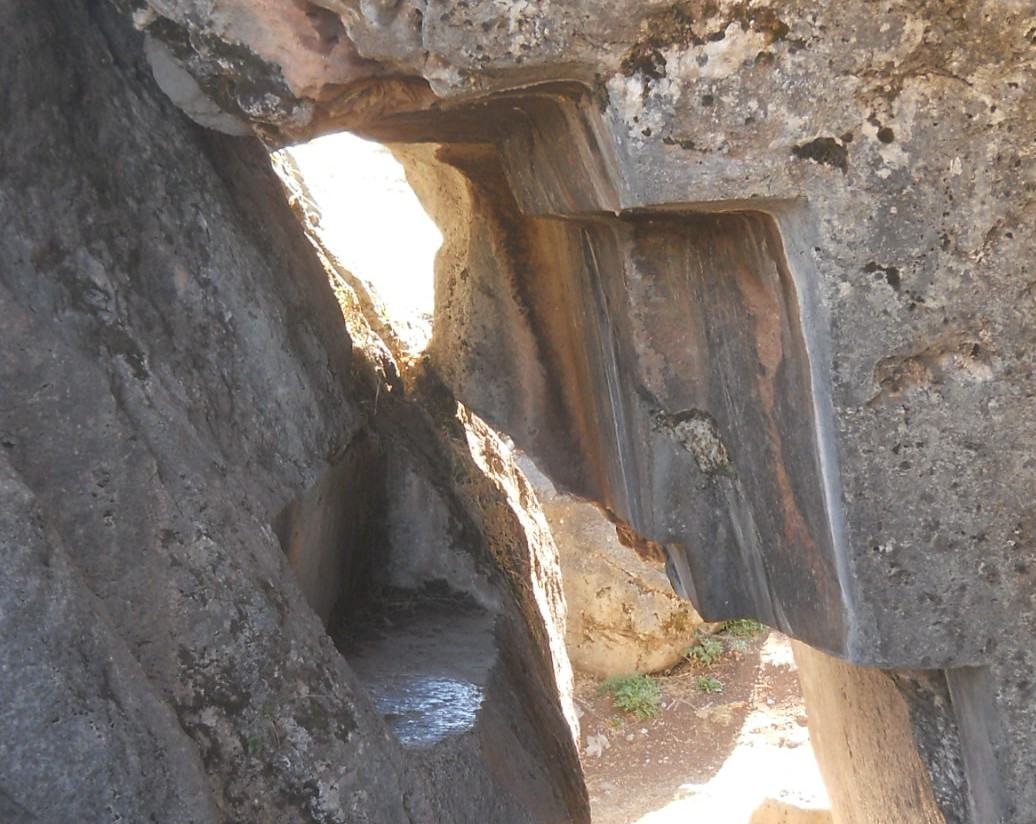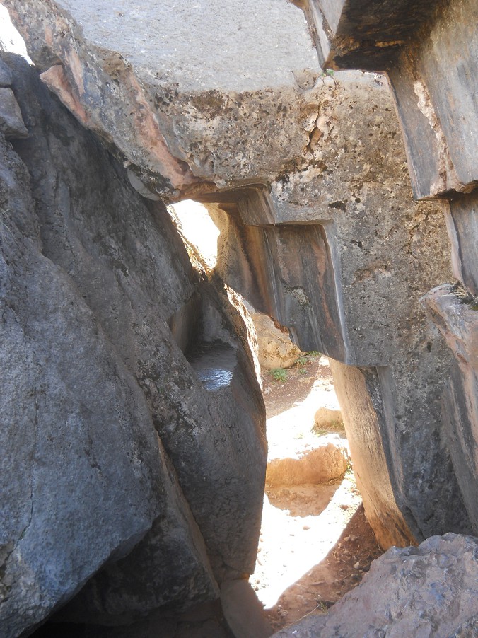 Sacsayhuamán (Cusco), grosser Steinbruch, der Korridor zwischen zwei Felsen mit grossen Schnitten - die umgedrehte Treppe im Korridor - Nahaufnahmen