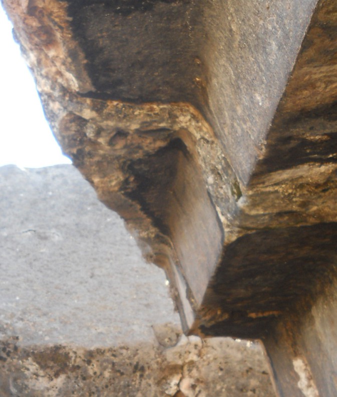 Sacsayhuamán (Cusco), grosser Steinbruch, la roca con trono con die umgedrehte Treppe, Detail 4, die Schnittflächen 1