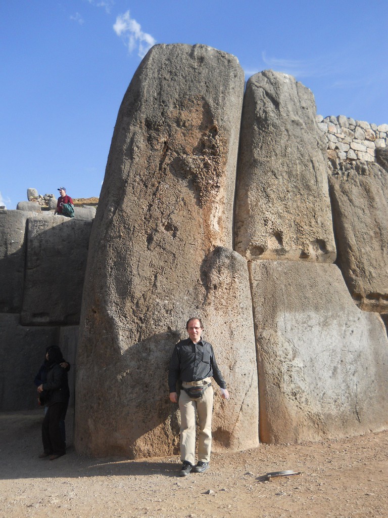 Cusco Sacsayhuamán, giant zigzag wall, one of the giant stones - Michael Palomino at the giant stone - detail 11