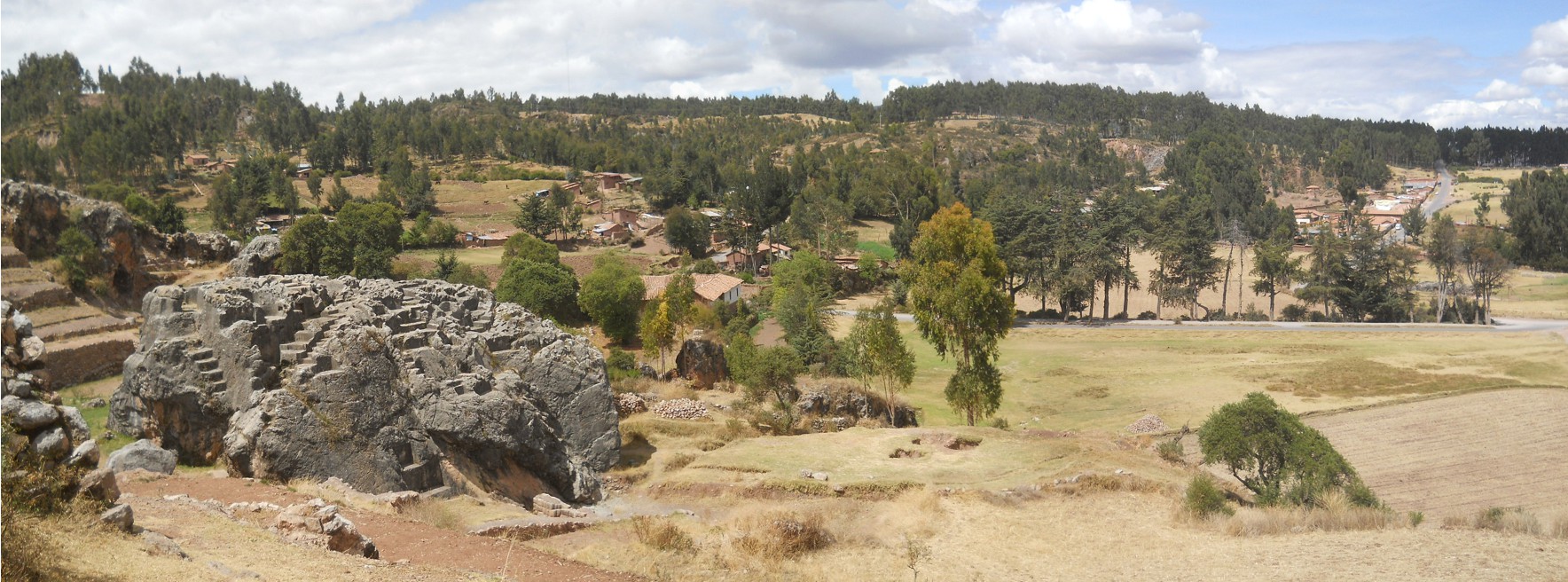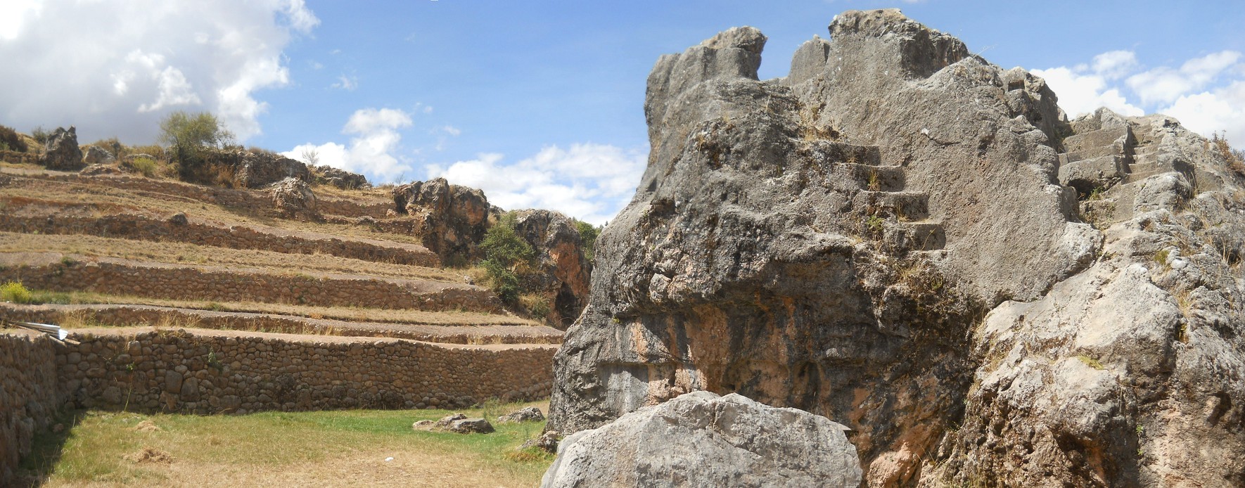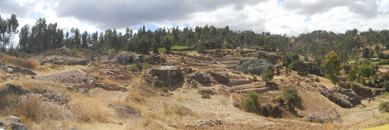 Cusco Sacsayhuamán, the rock of stairs and thrones "Chinchana grande" in the meadows, panorama