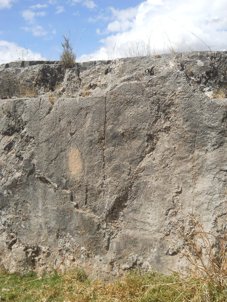 Cusco Sacsayhuamán, on the way to the rock of stairs and thrones "Chinchana grande", giant stone with surfaces with engravings - zoom