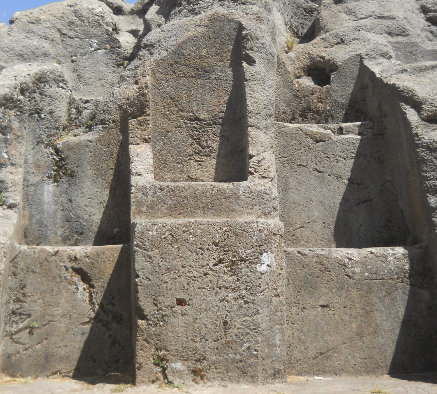 In this rock of stairs and stones "Chinchana grande" are masses of stairs and thrones cut into the rock. In the lower part the rock is black and red.