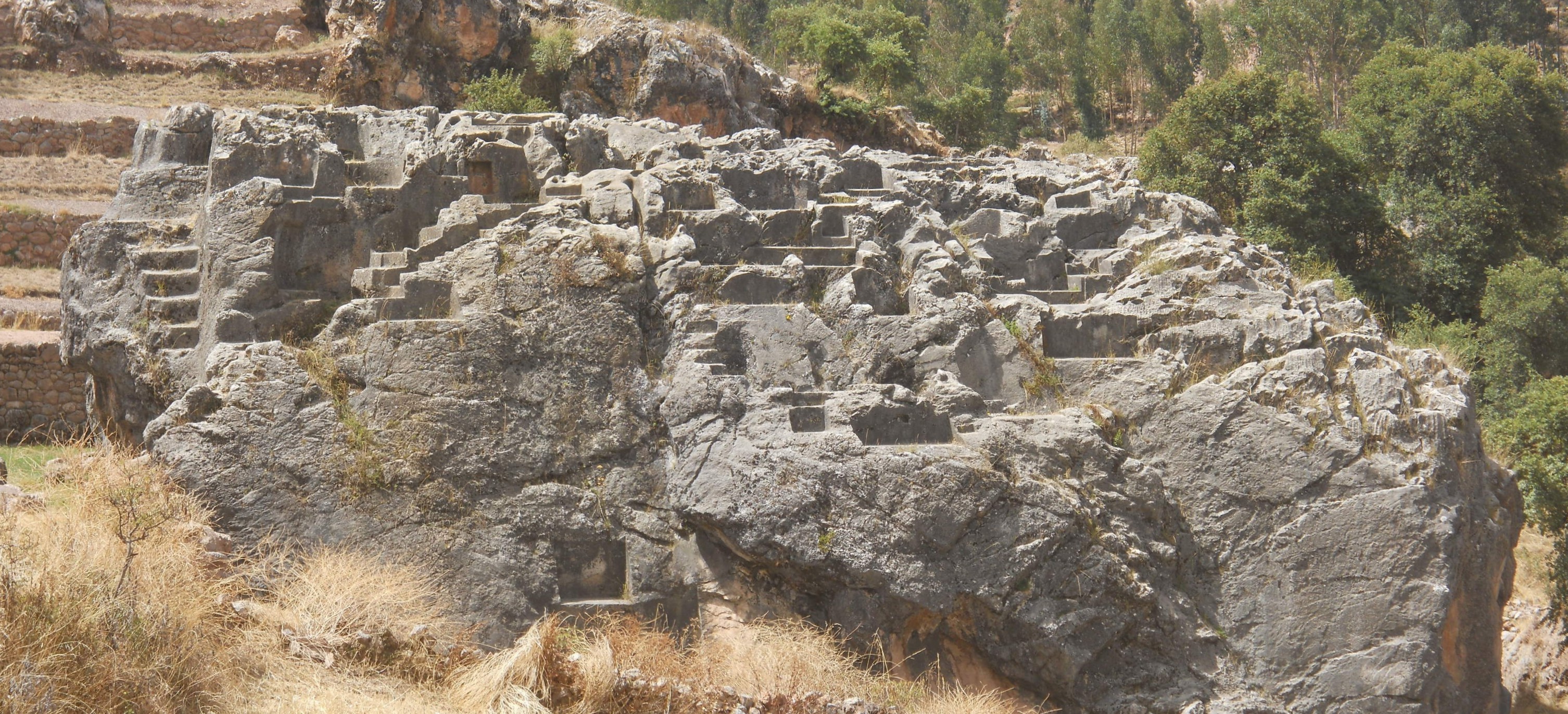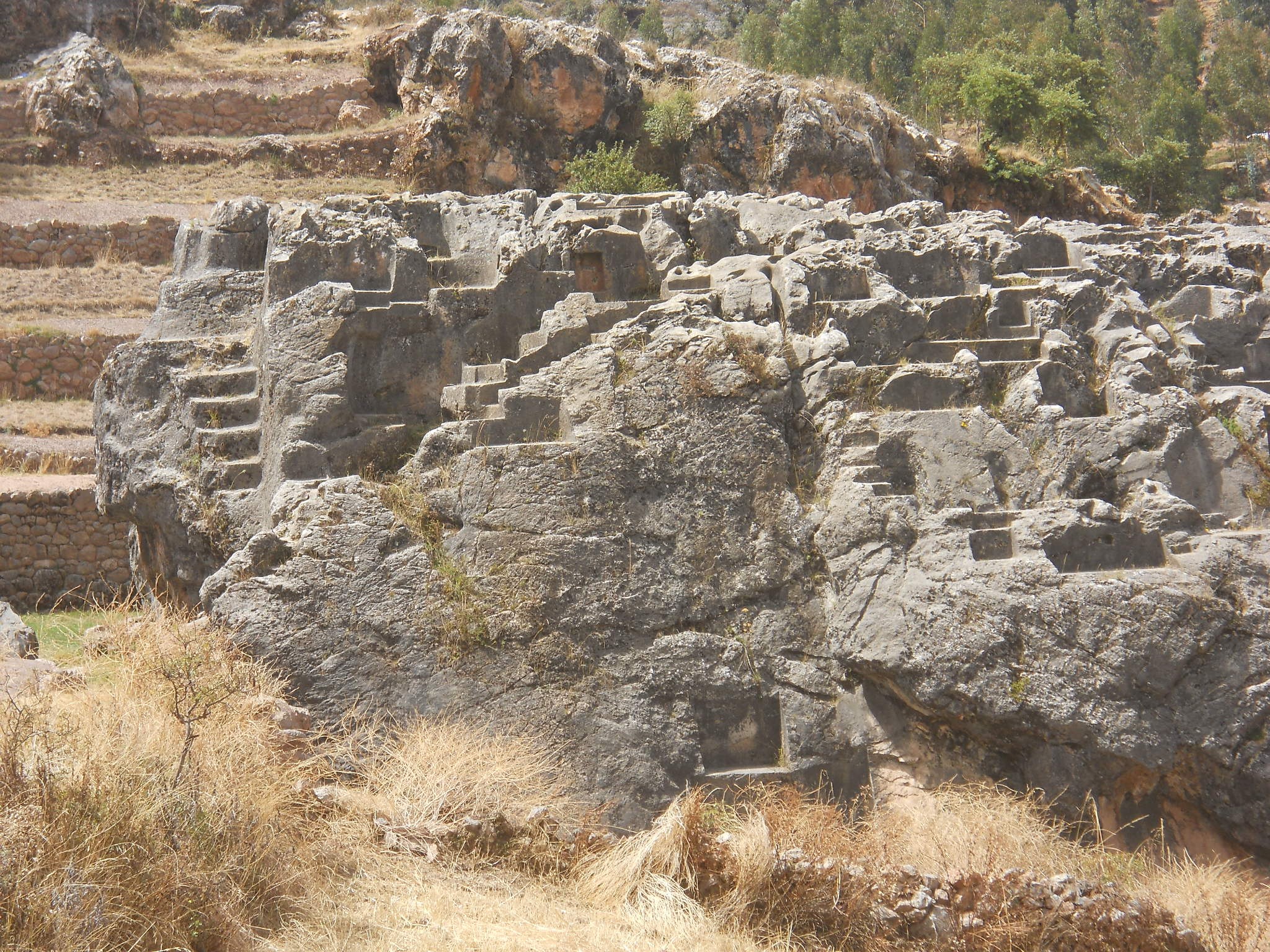 Cusco Sacsayhuamán, rock of stairs and thrones "Chinchana grande", view 5 with many platforms and thrones, zooms 1,2