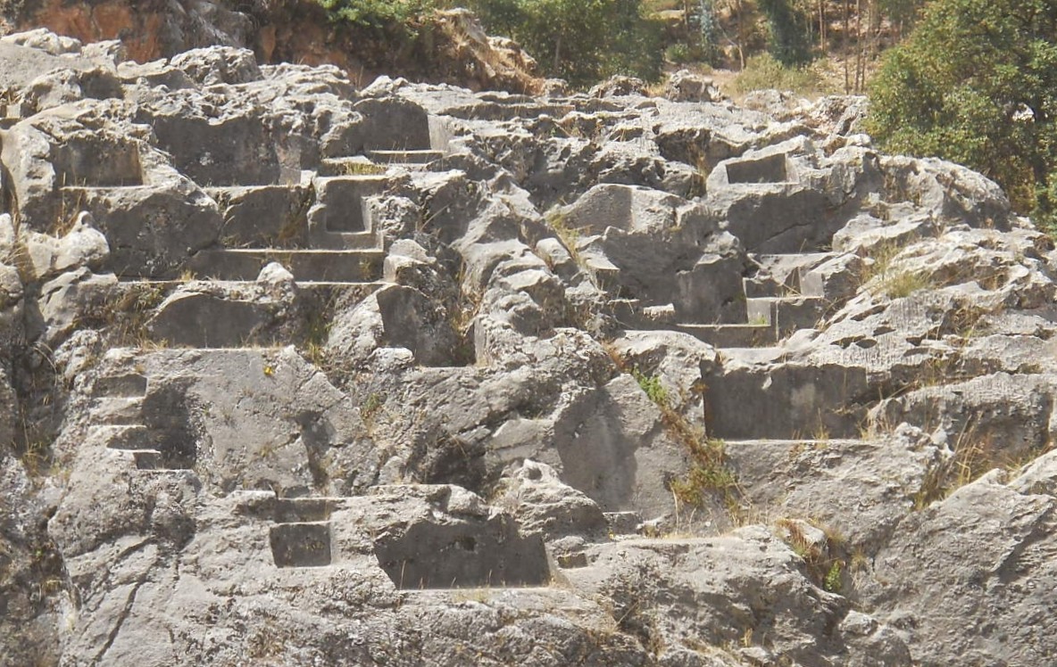 Cusco Sacsayhuamán, rock of stairs and thrones "Chinchana grande", view 5 with many platforms and thrones, zoom with many thrones