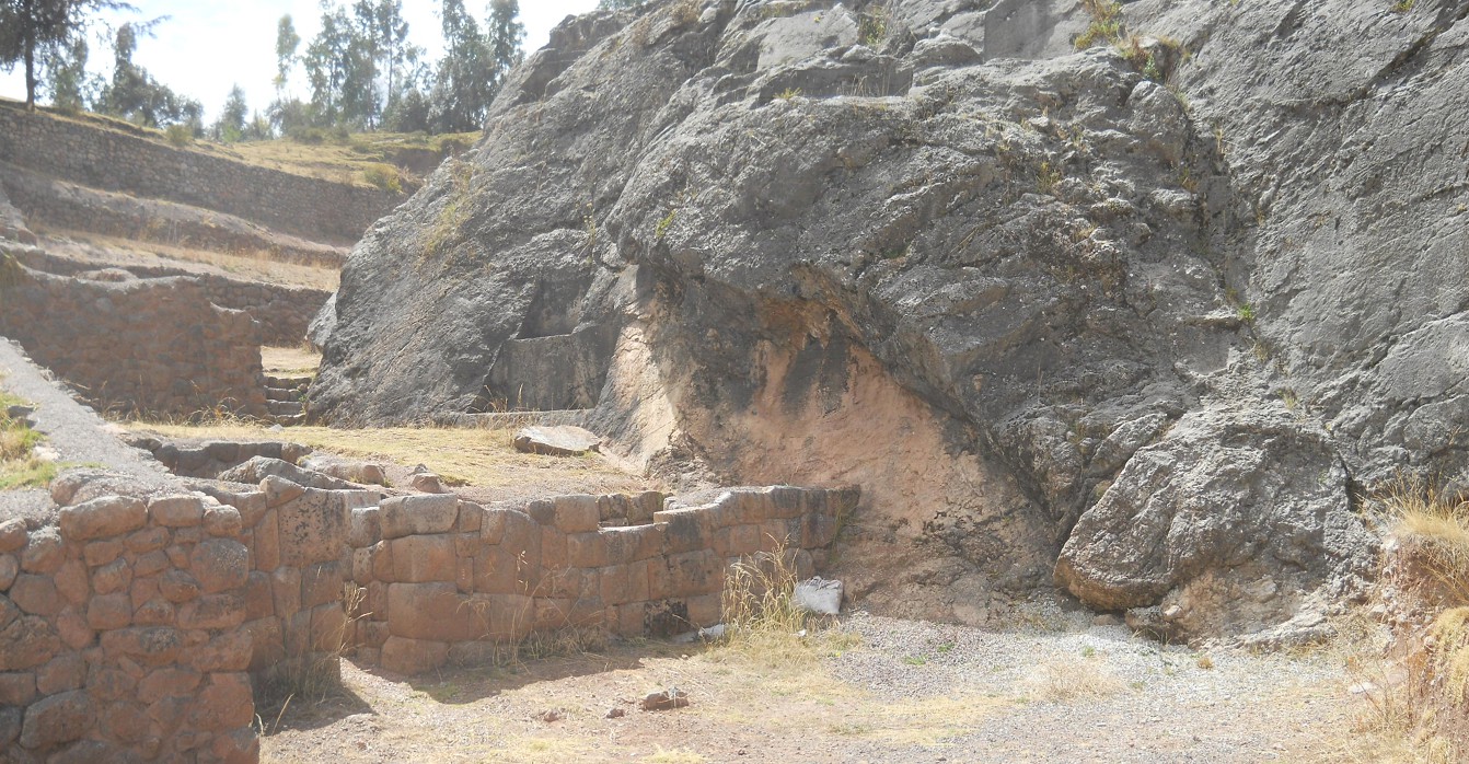Area of the rock of stairs "Chinchana grande": perfect Inca wall with curvy niche, panorama