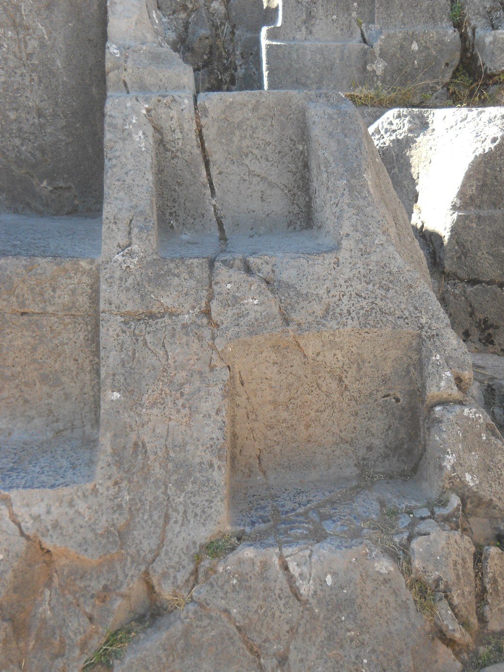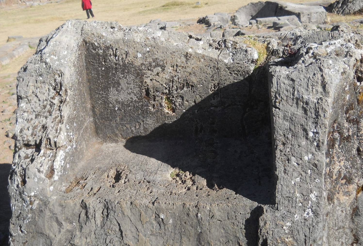 Cusco Sacsayhuamán: in the amphitheater near the throne wall there are cuts in the rock with right angles, zoom